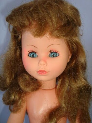 Su cara es angelical, no hay adjetivo que la describa mejor. Su boca cerrada y ligeramente sonriente tiene los labios pintados en dos tonos, con la parte interior en un rosa más claro y la exterior en uno más oscuro. La nariz es proporcionada y sus ojos, de color azul, tienen la mirada ladeada hacia arriba a la derecha, unas larguísimas pestañas oscuras y diversas sombras de ojos. En el párpado superior, la hay de color rosa y, encima, un par en color marrón arena, de más oscura a más clara; en el inferior, tenemos una marrón bastante oscura, con una de tono más suave debajo.