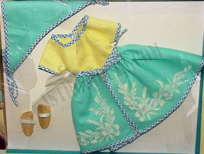 No me digáis que no es una monada. El conjunto es muy sencillito, se compone de pañal blanco con bordes azules y lazo del mismo color, que lleva unas braguitas debajo, más la camiseta sin mangas, también blanca y con bordes azules a la altura de los hombros y cuello. El toque más original son los bordados de los bajos de la camiseta, en blanco y rosa, con agujeros y motivos florales. Nunca había visto la versión en la que se combinaban ambos colores, solo en azul y rosa, respectivamente, por lo que esta debía ser una versión menos recurrente o, al menos, no salía en catálogos.