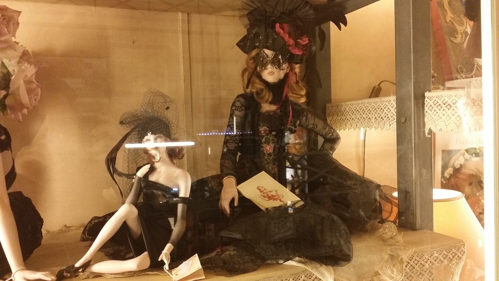 Nada más entrar veías preciosas vitrinas de figuras de hadas y ninfas (son mis perdiciones, como las figuras de bebés, angelitos... ¡De mayor no cabré en mi casa!) muchos juguetes de madera, maravillosas máscaras venecianas... También habían muchas vitrinas con hermosos muñecos y muñecas de temática fantástica, como si vivieran en un bosque mágico: