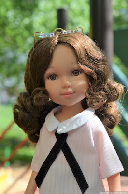 En cuanto al pelo, es de un bonito color rubio cerveza y se trata de una media melena recogida en dos colas bajas, que quedan a la altura del hombro. Siento la tentación de soltarlas por si está mejor con el pelo suelto pero, como en todas las fotos que hay suyas en la red lo lleva con el recogido de fábrica, no puedo hacerme una idea de cómo le queda y me da reparo que luego esté peor. En fin, con las dos coletitas está mona y le da más aire de colegiala traviesa. Eso sí, en las fotos de internet (y las oficiales) veo que lleva gomas de plástico transparente, mientras la mía viene con las típicas de pollo, que desentonan un poco, aunque por suerte el color se camufla un poco con el tono de pelo.