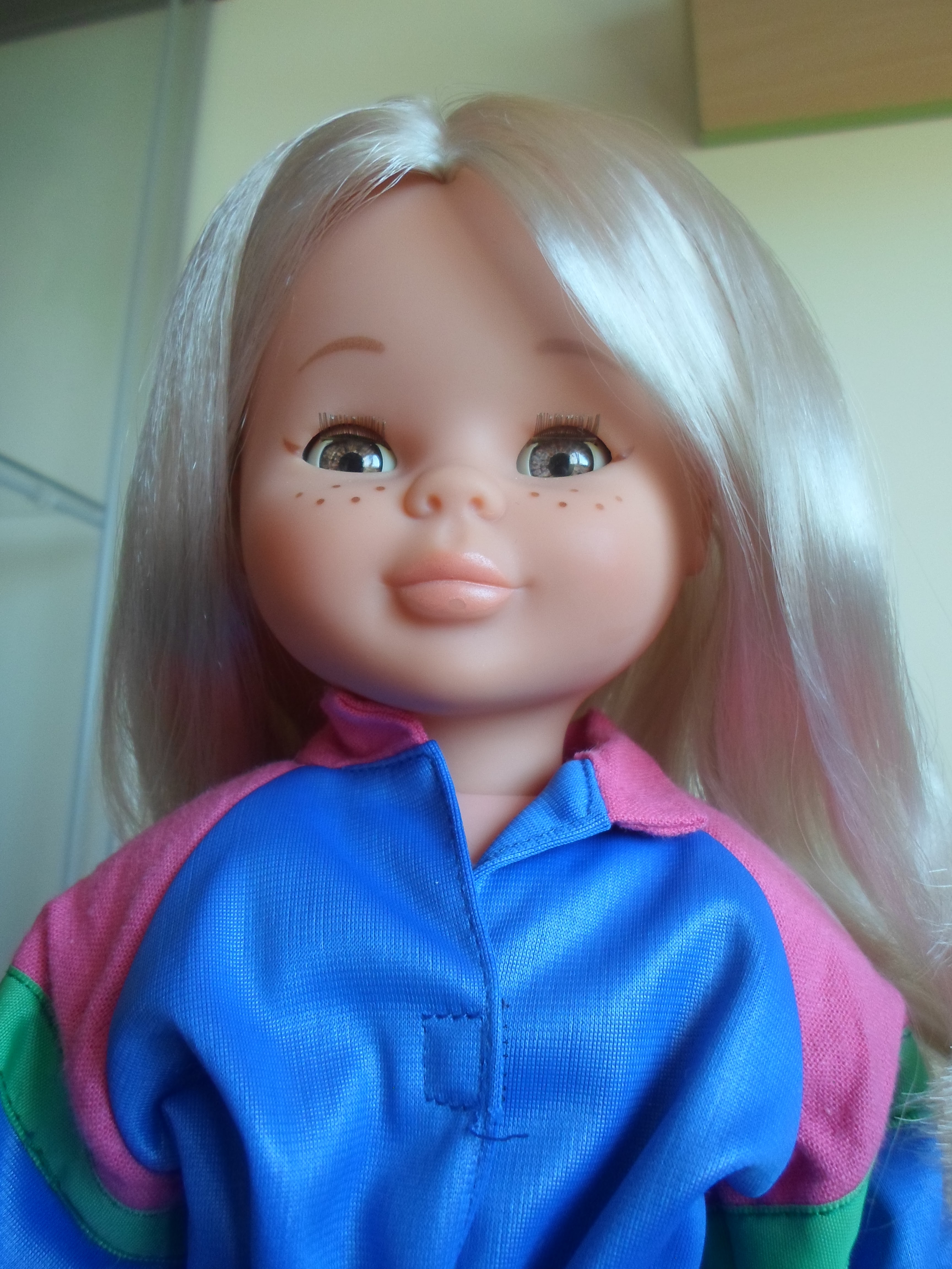 De cara es preciosa. A mí lo que me llamó tanto la atención de esta muñeca y que me hizo tener claro que era la que buscaba de entre las pecosas era ese contraste entre el rubio platino y sus ojos marrones. La mayoría de Nancys los tienen azules, si bien es cierto que muchas los tienen de color miel, como mi querida pelirroja, pero este marrón oscuro en rubias no lo tenía yo muy visto y me cautivó. En las fotos del anuncio le vi una carita super dulce.