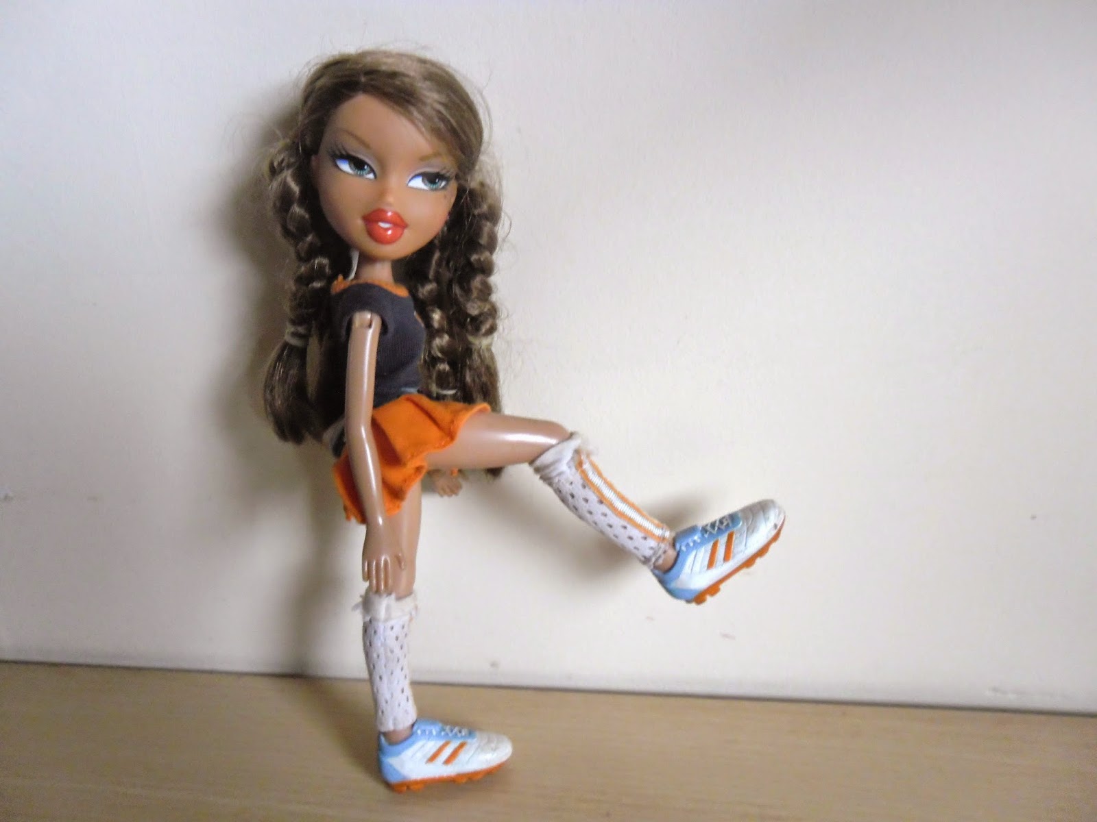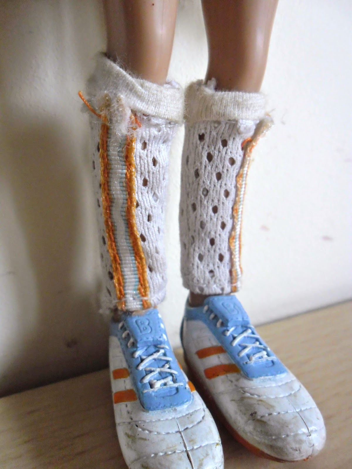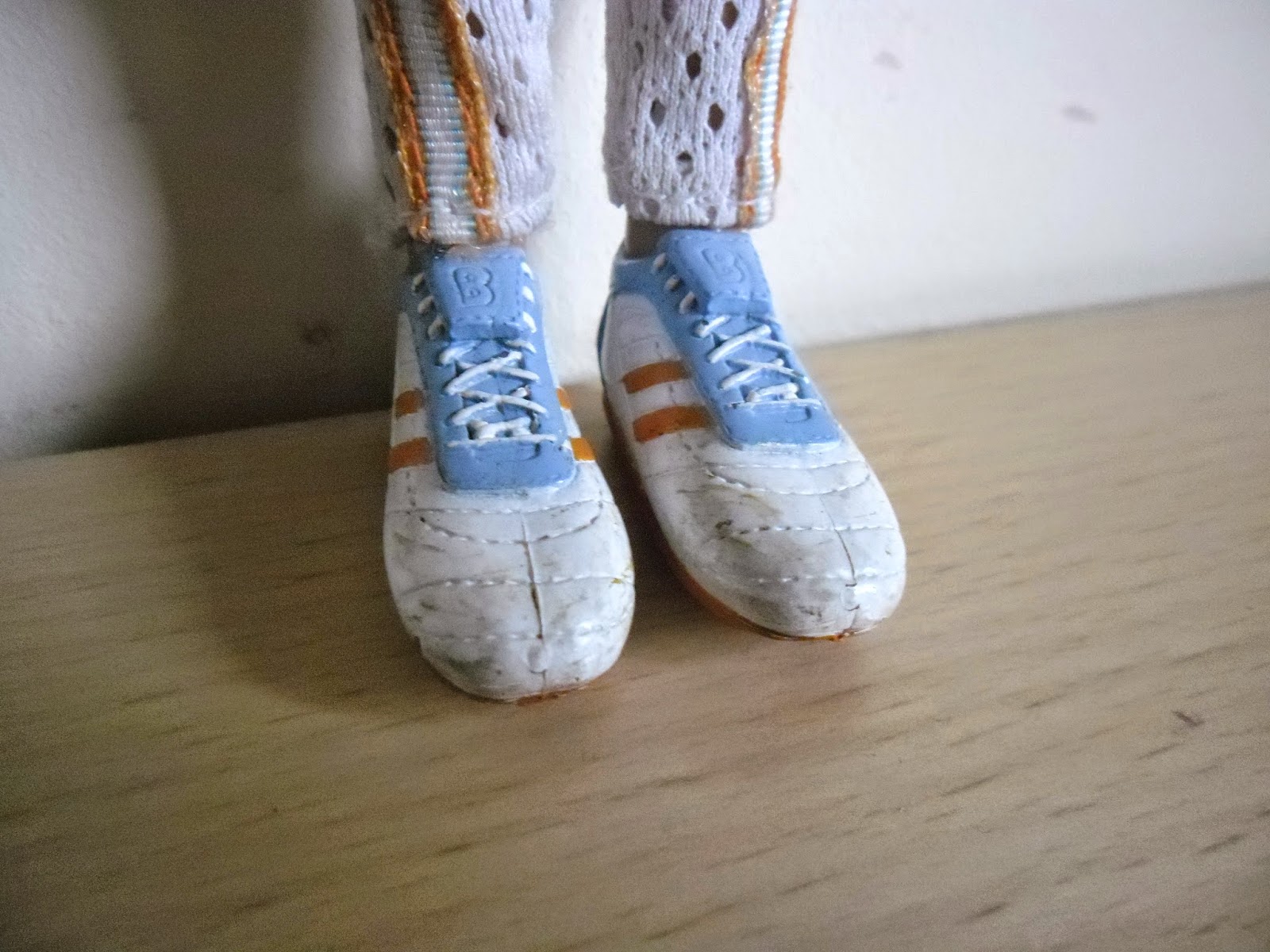 Sus bambas deportivas están muy bien hechas y detalladas para estar pintadas en un molde.No sé si conocéis los pies de las Bratz,pero son especiales.No tienen,son unos anclajes que se enganchan con el agujero hecho a su medida de los zapatos,así no se pierden tan fácilmente,se pueden quitar y poner de manera sencilla,y son muy originales.Lleva unos calentadores deportivos muy realistas.