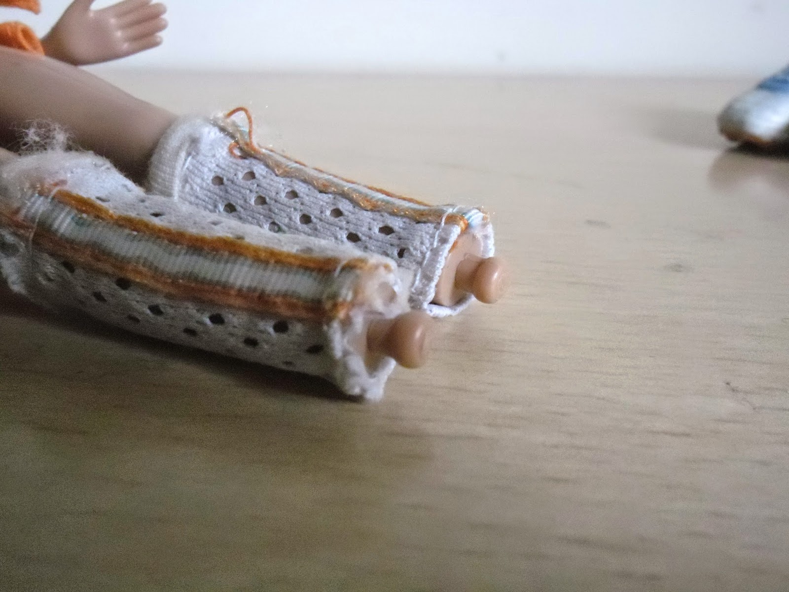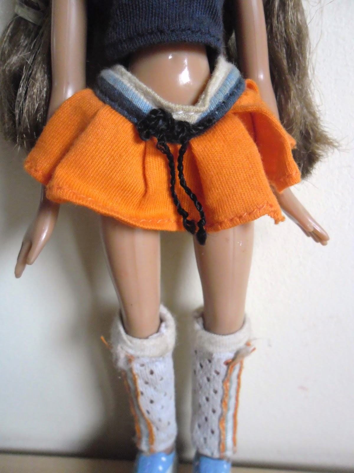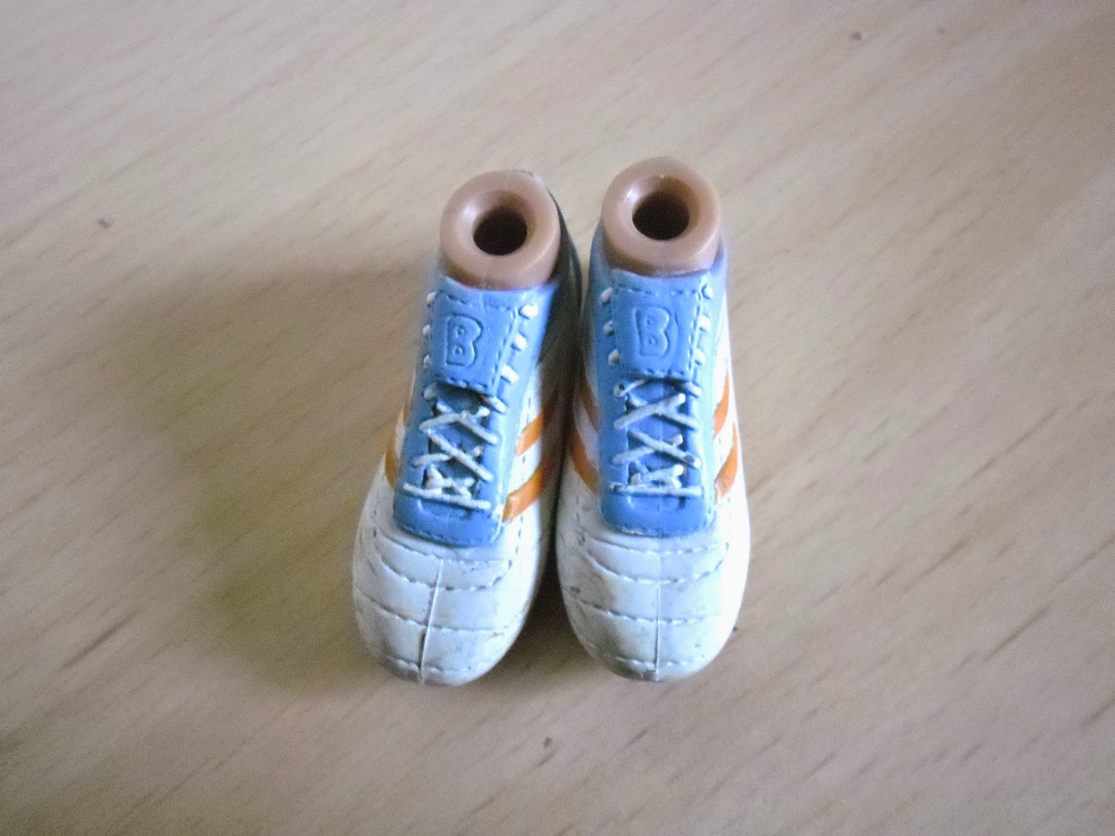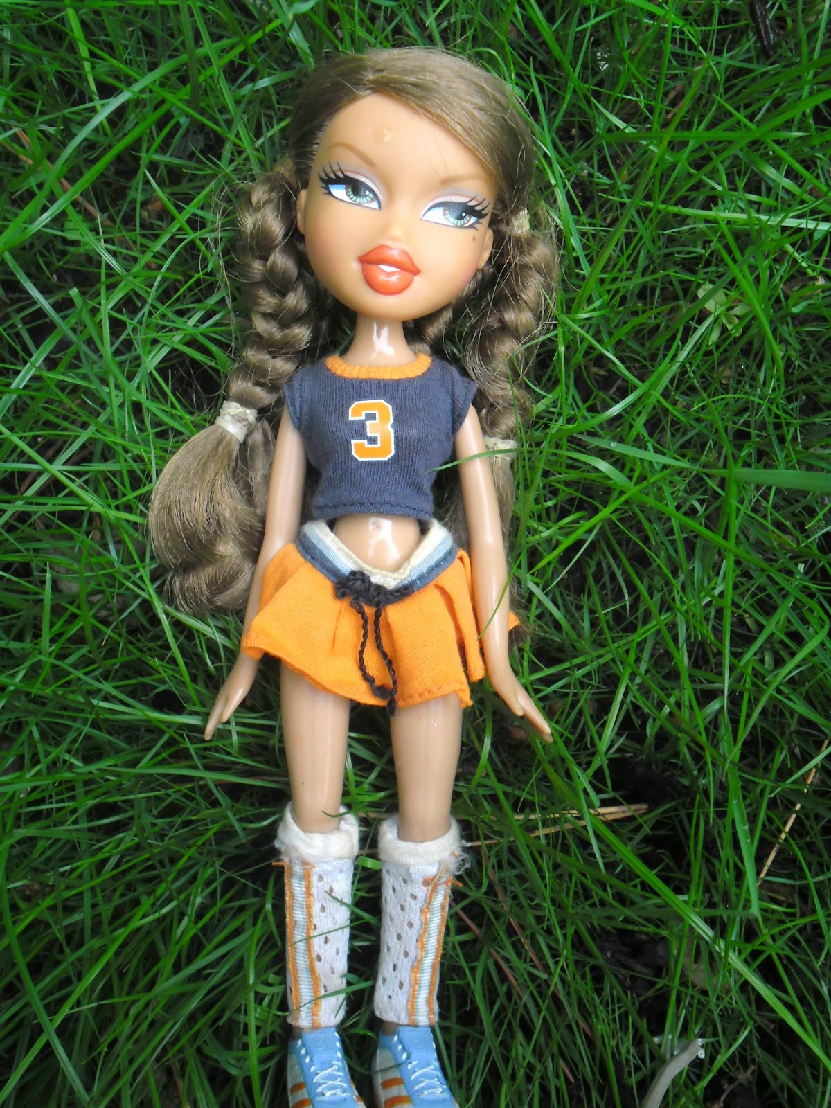 Sus bambas deportivas están muy bien hechas y detalladas para estar pintadas en un molde.No sé si conocéis los pies de las Bratz,pero son especiales.No tienen,son unos anclajes que se enganchan con el agujero hecho a su medida de los zapatos,así no se pierden tan fácilmente,se pueden quitar y poner de manera sencilla,y son muy originales.Lleva unos calentadores deportivos muy realistas.