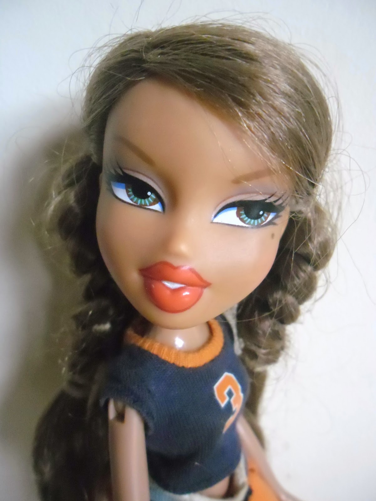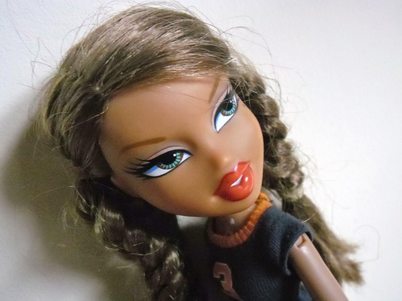 Su maquillaje es precioso.Excesivo para hacer deporte,sí,¡pero ya sabéis,ellas son las Bratz!Sus labios me encantan,entreabiertos,con pintalabios rojo-anaranjado y reseguidos por un lápiz labial granate.Los enormes ojos son marrones con "destellos de un tono azul verdoso.Su sombra de ojos es de color rosa nude y gris ahumado.