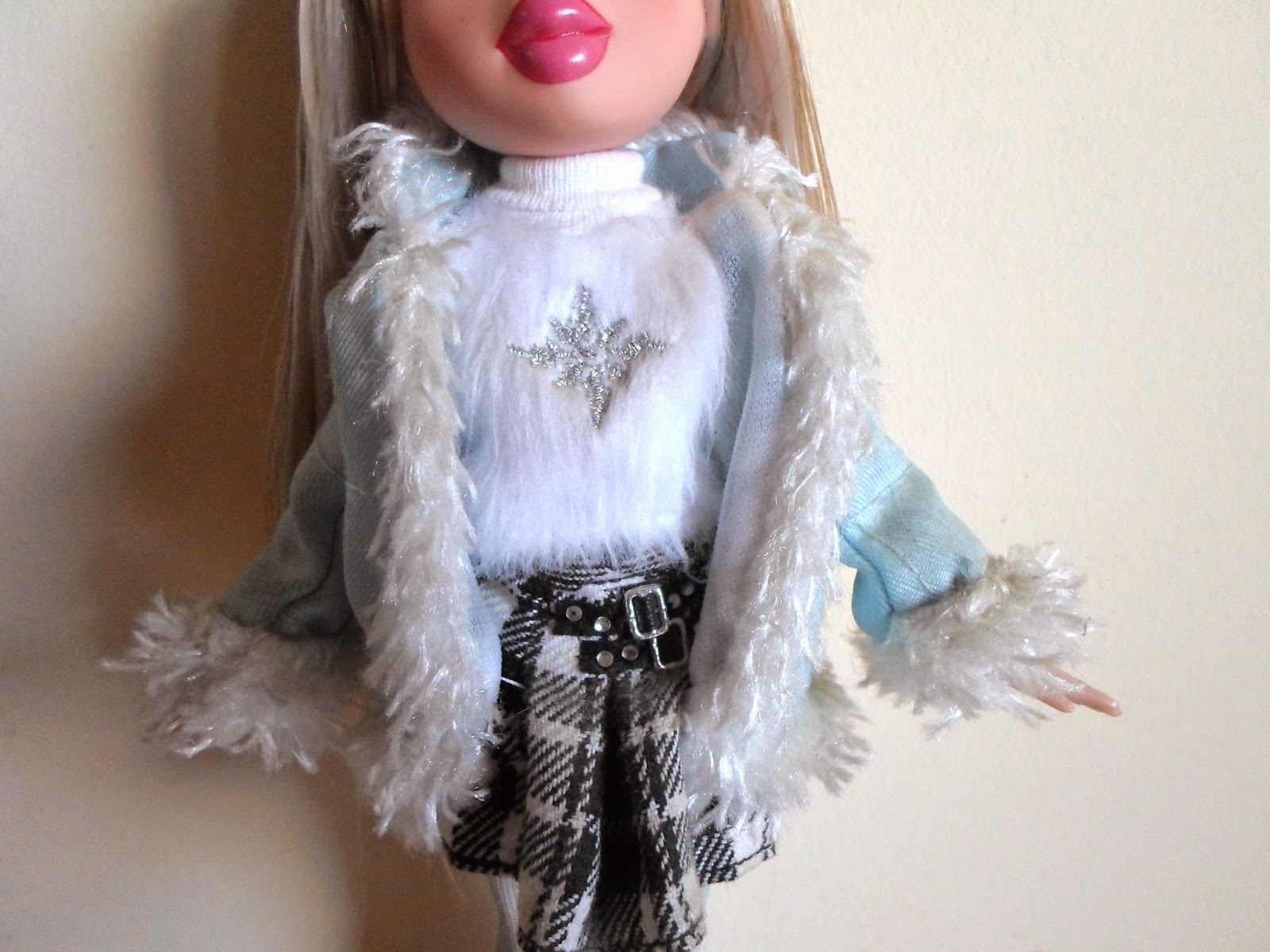 Su outfit es maravilloso.Su falda de estampado "escocés" negro y blanco con un bonito cinturón negro con perlitas es perfecta.La chaqueta con los bordes de las mangas y las oberturas con pelo me encanta.Pero lo mejor es esa camisa de cuello alto de pelo,muy muy suave,con un copo de nieve bordado.