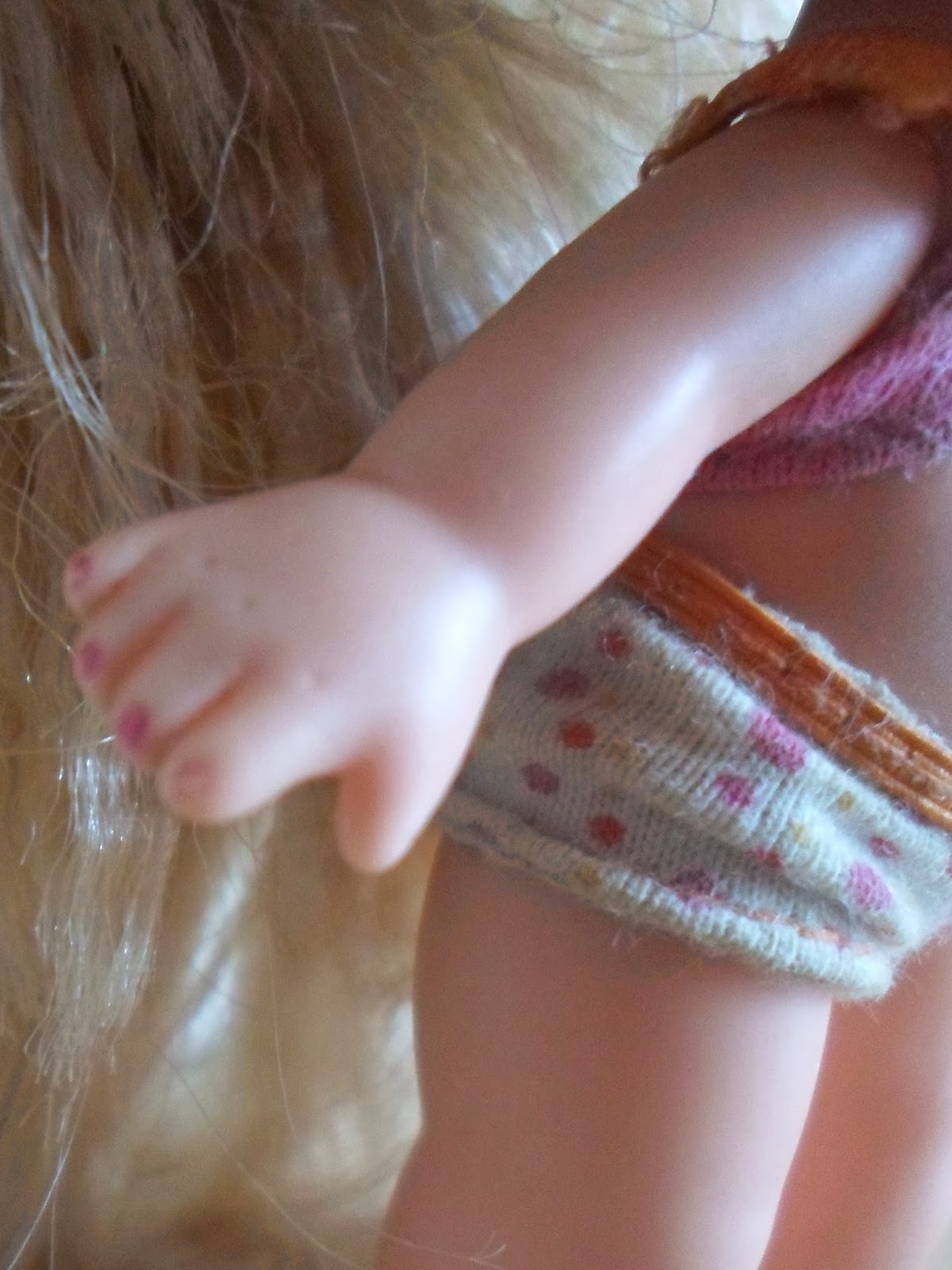 Su ropa se compone por un pantaloncito blanco con lunares amarillos y rosas y una camiseta rosa de tirantes naranjas.Sus uñas están pintadas de color rosa fucsia.