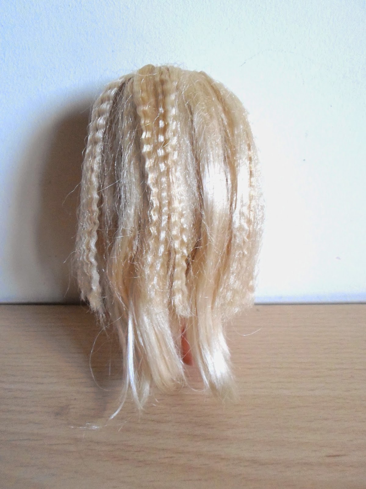 El pelo tiene 3 grandes moños de los que sale ese largo pelo rubio y ondulado(o más bien hecho una masa).