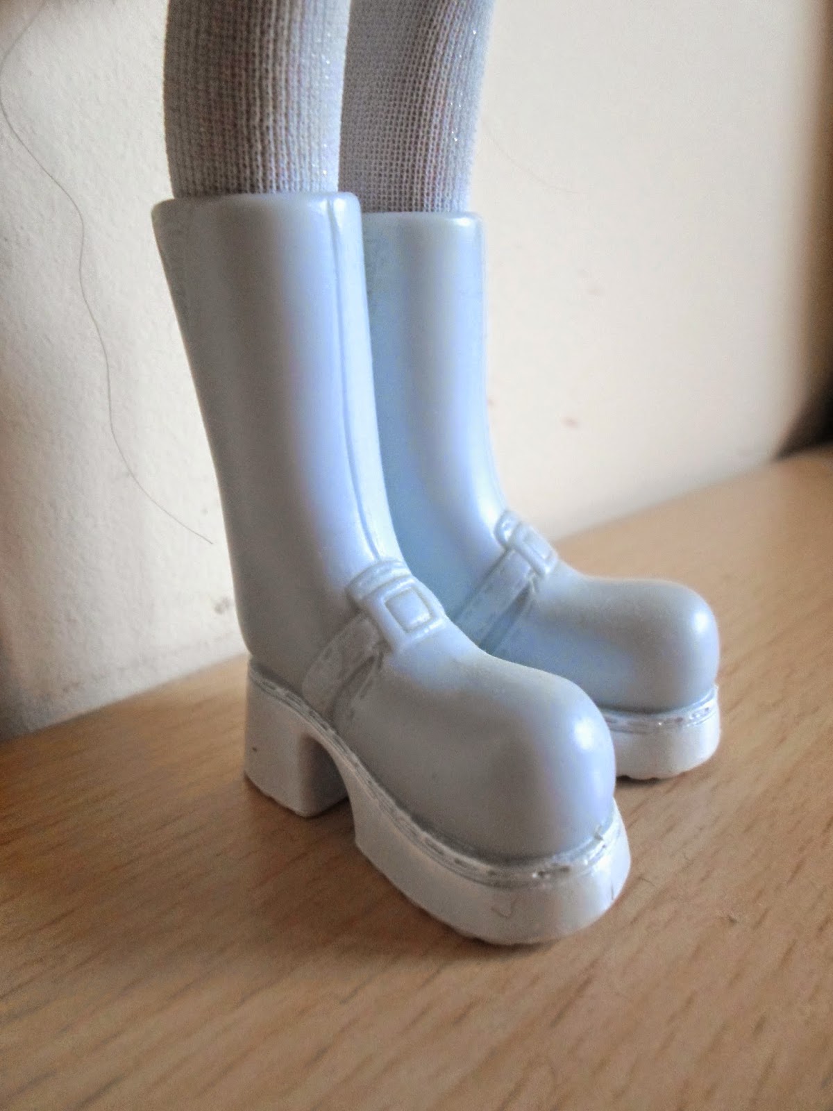 Sus botas para estar en la nieve son azul celeste apagado,con unas plataformas muy altas.Además,lleva unas medias azules.