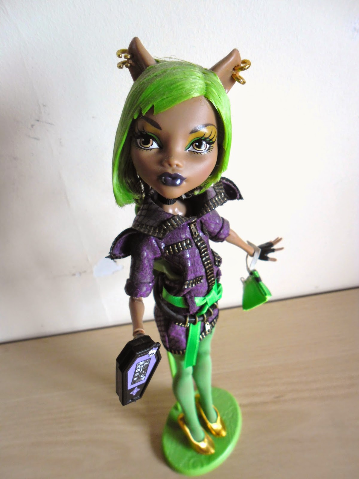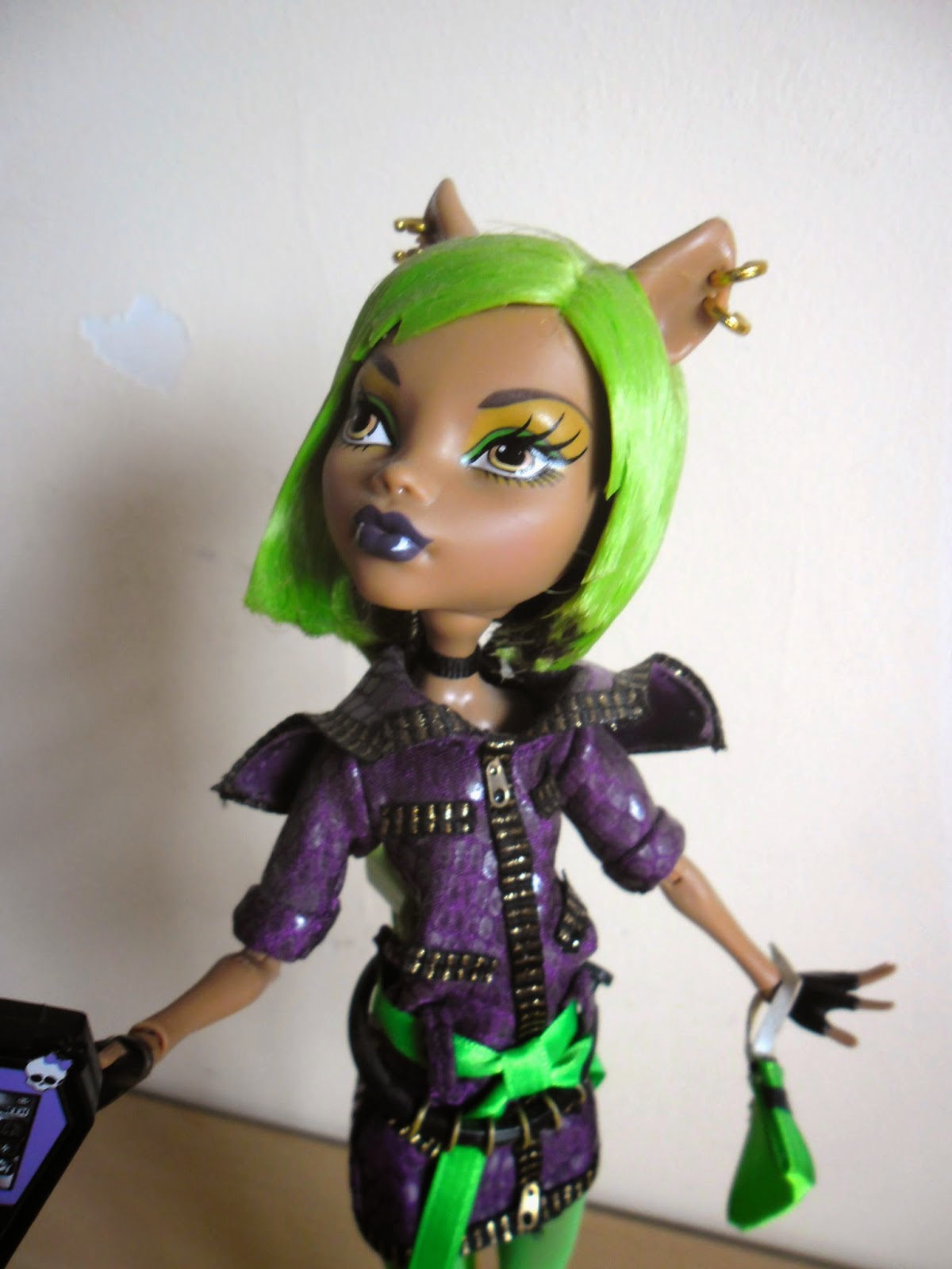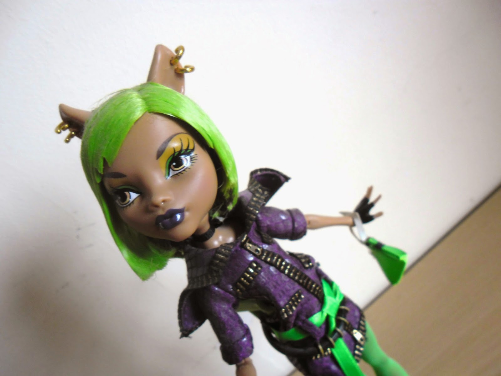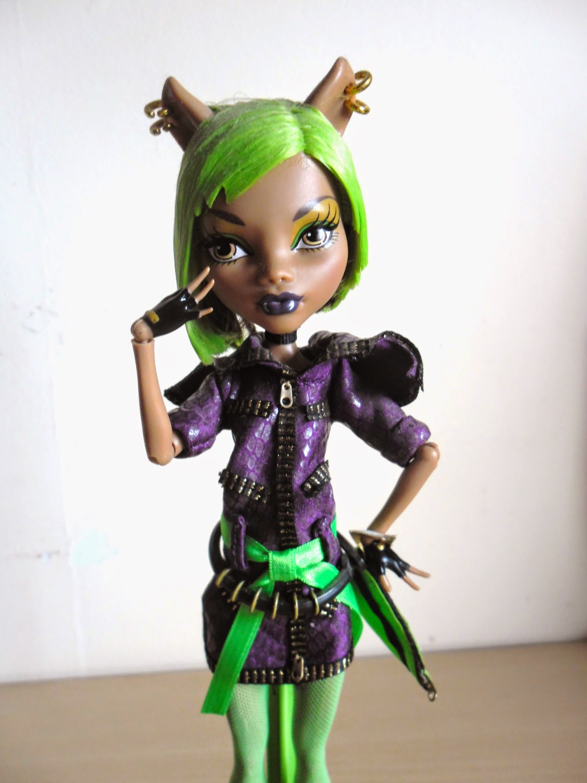 El pelo como veis es lo que más llama la atención,es corto,es verde neón(¿cuántas veces he dicho ya esa palabra en esta entrada?),y por detrás tiene unos cuantos mechones marrones,el color original de Clawdeen.
