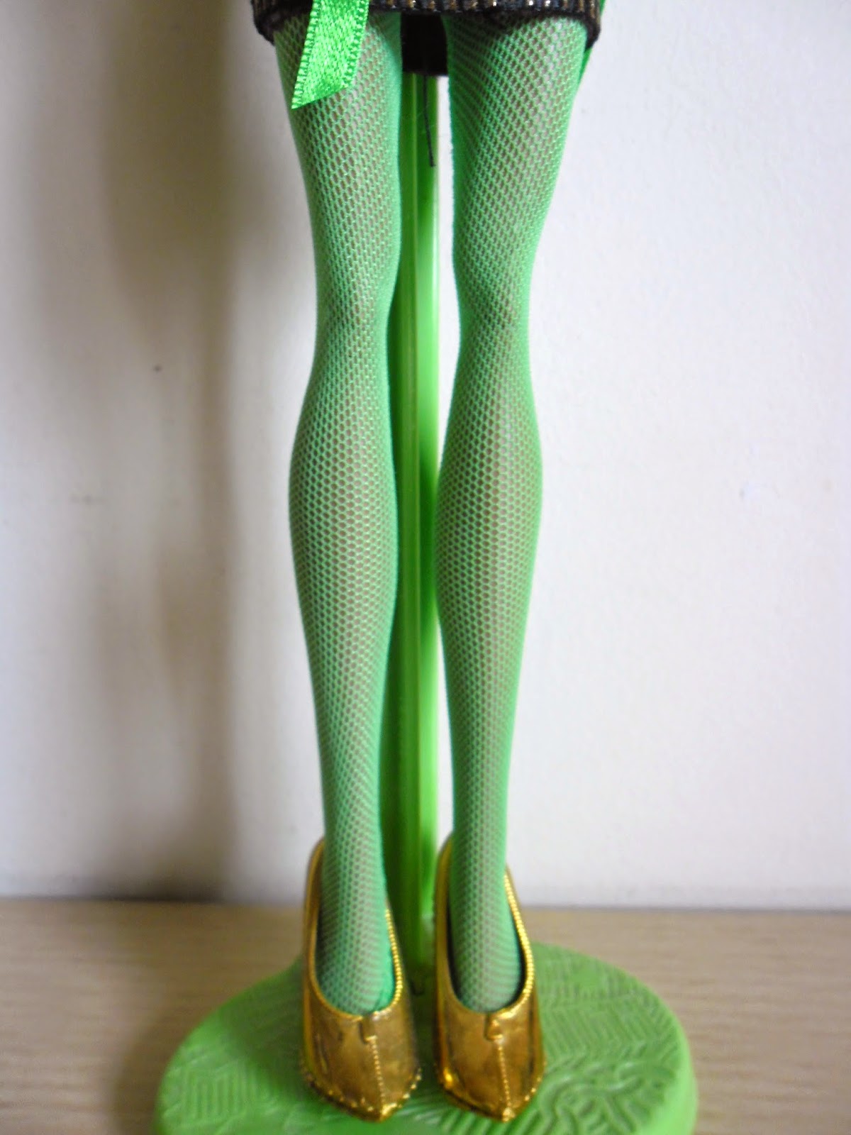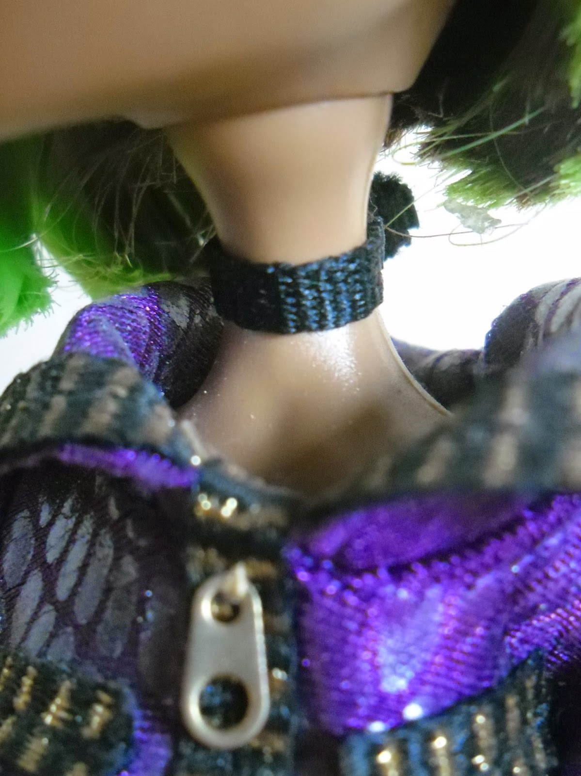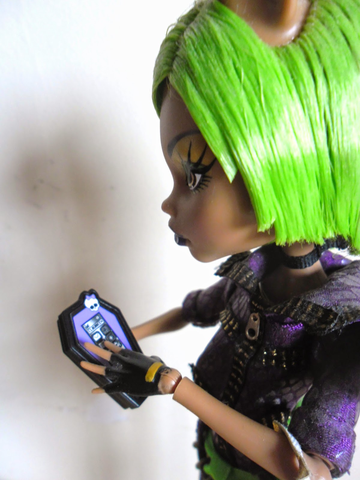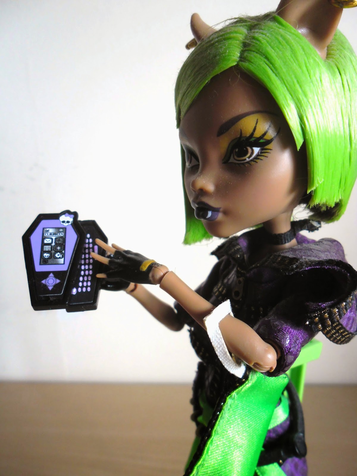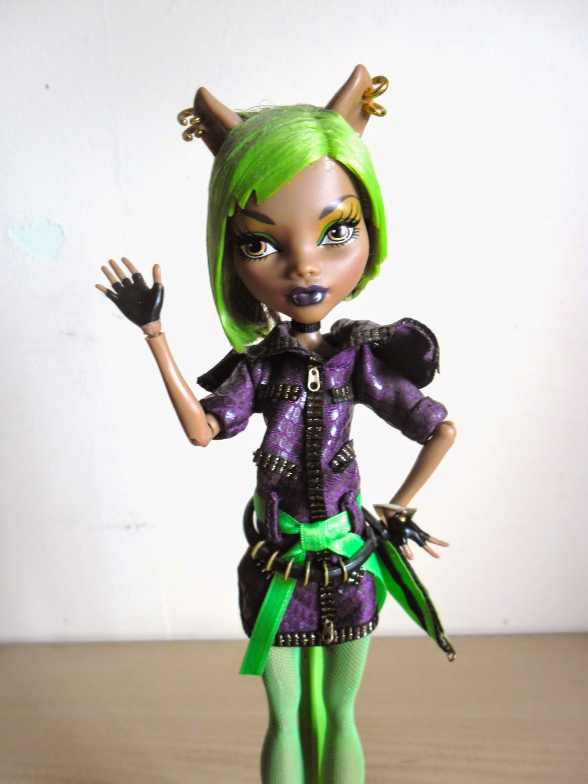 El pelo como veis es lo que más llama la atención,es corto,es verde neón(¿cuántas veces he dicho ya esa palabra en esta entrada?),y por detrás tiene unos cuantos mechones marrones,el color original de Clawdeen.