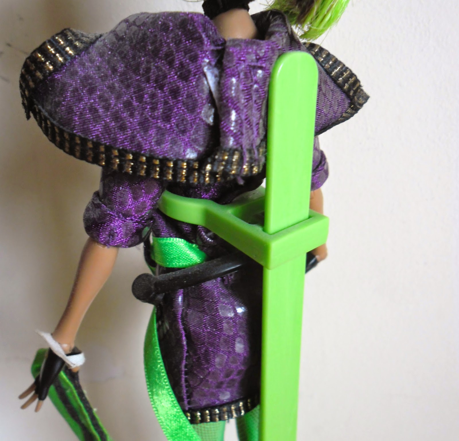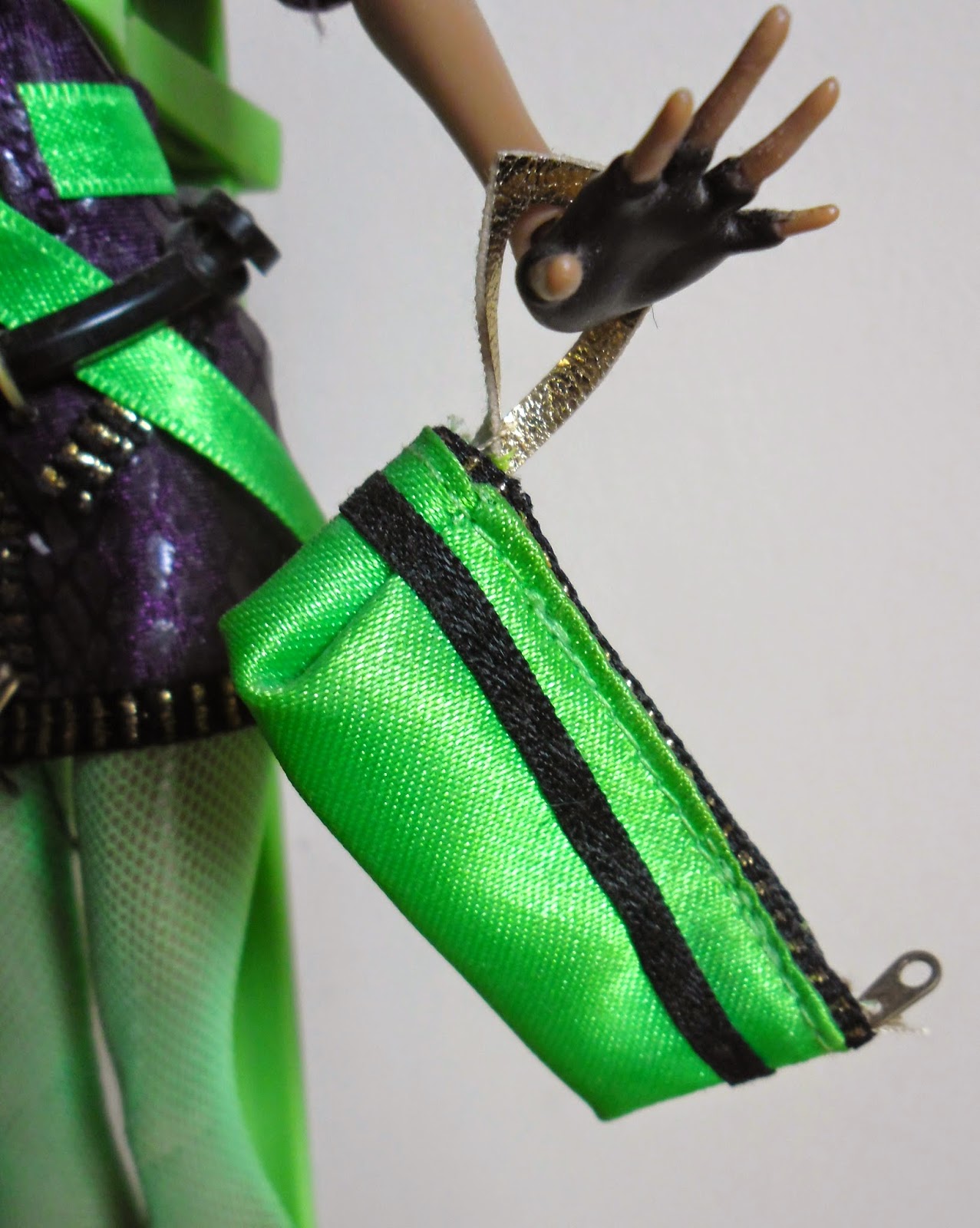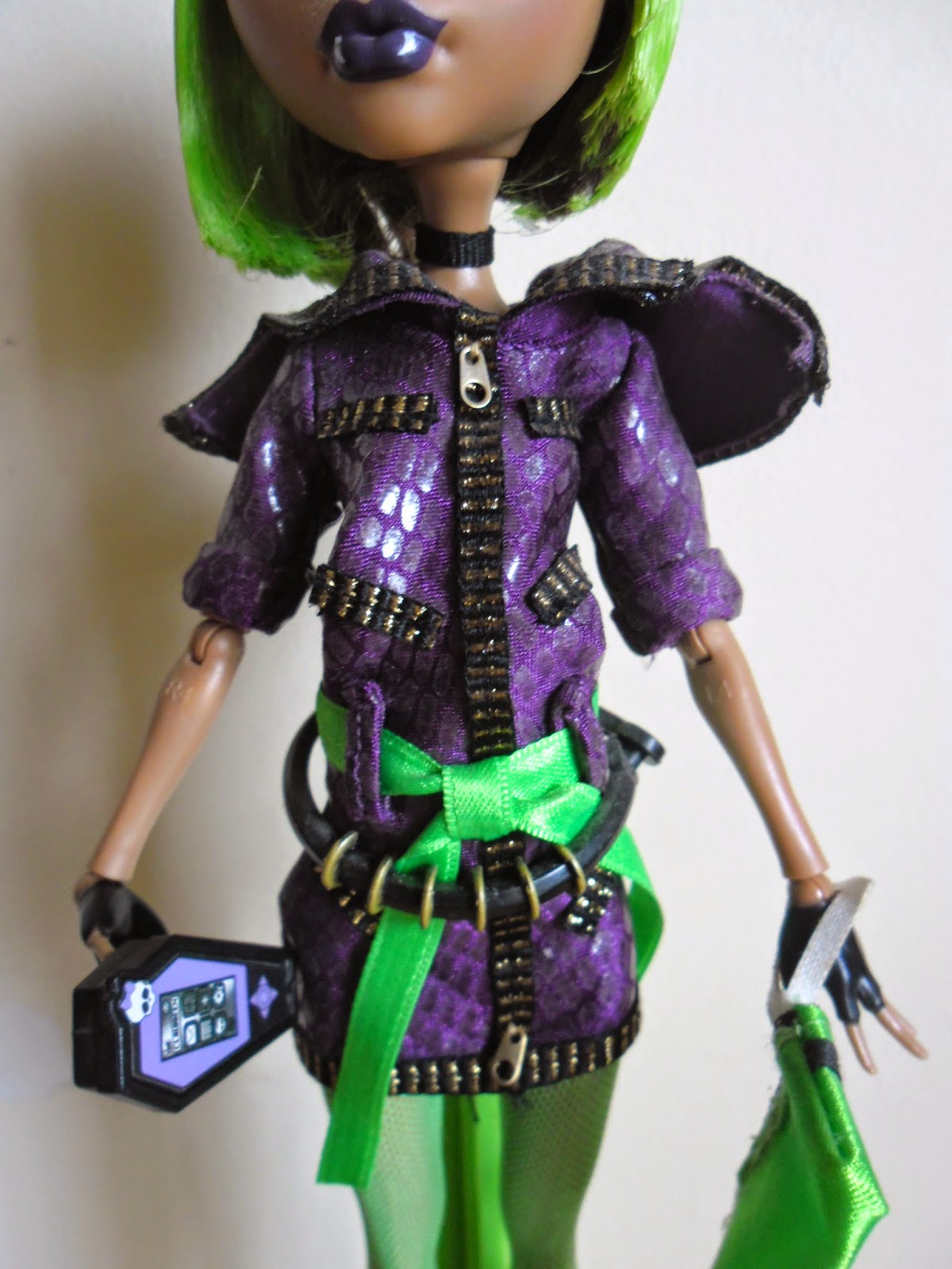 Su vestido es de color violeta,y además,parece que está cubierto por escamas de serpiente(¡me encanta el vestido!Aunque no que maten a serpientes para hacer vestidos...).El vestido tiene cremalleras por todas partes(unas de las mayores características de esta monstruita en lo que se refiere a su vestimenta).Además,tiene un cinturón negro ancho que le rodea la cintura y un lazo verde neón(es bastante chillón,pero así,hace que resalte más el vestido).Por detrás,el cuello del vestido,cae por la espalda.