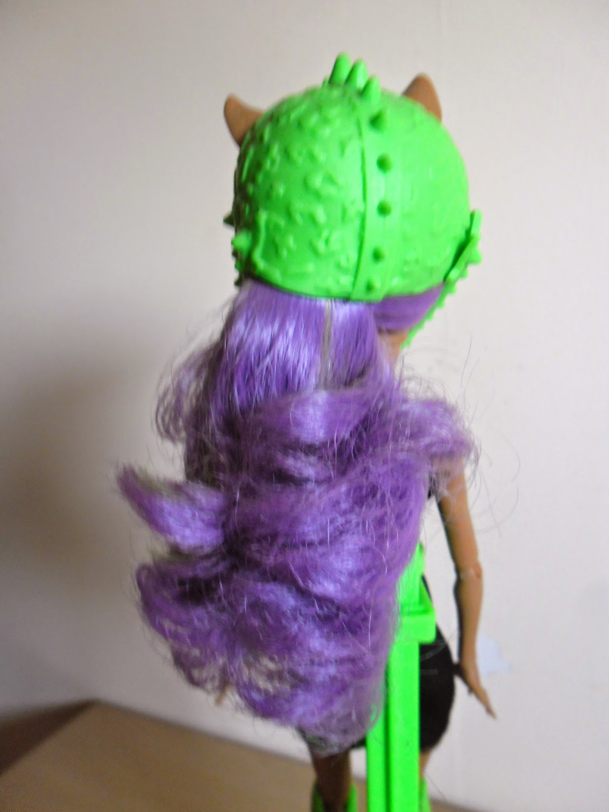 El pelo es morado,recogido en una cola hacia el lado,y tiene unas mechas verdes que combinan genial con su color de pelo,son el toque perfecto.