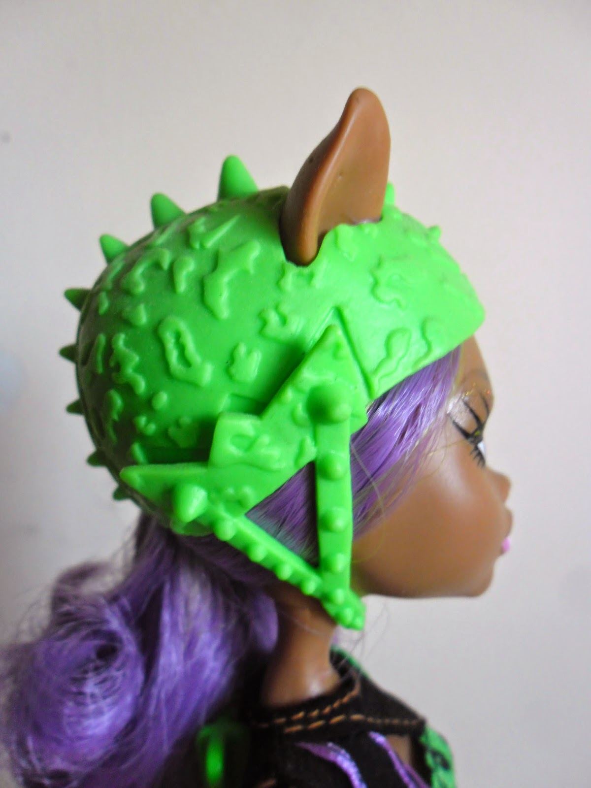 Su casco es verde neón,con estampado en relieve de leopardo(¿cuántas veces habré dicho eso en este post?),con una tira que tiene unos pinchos en cada extremo.