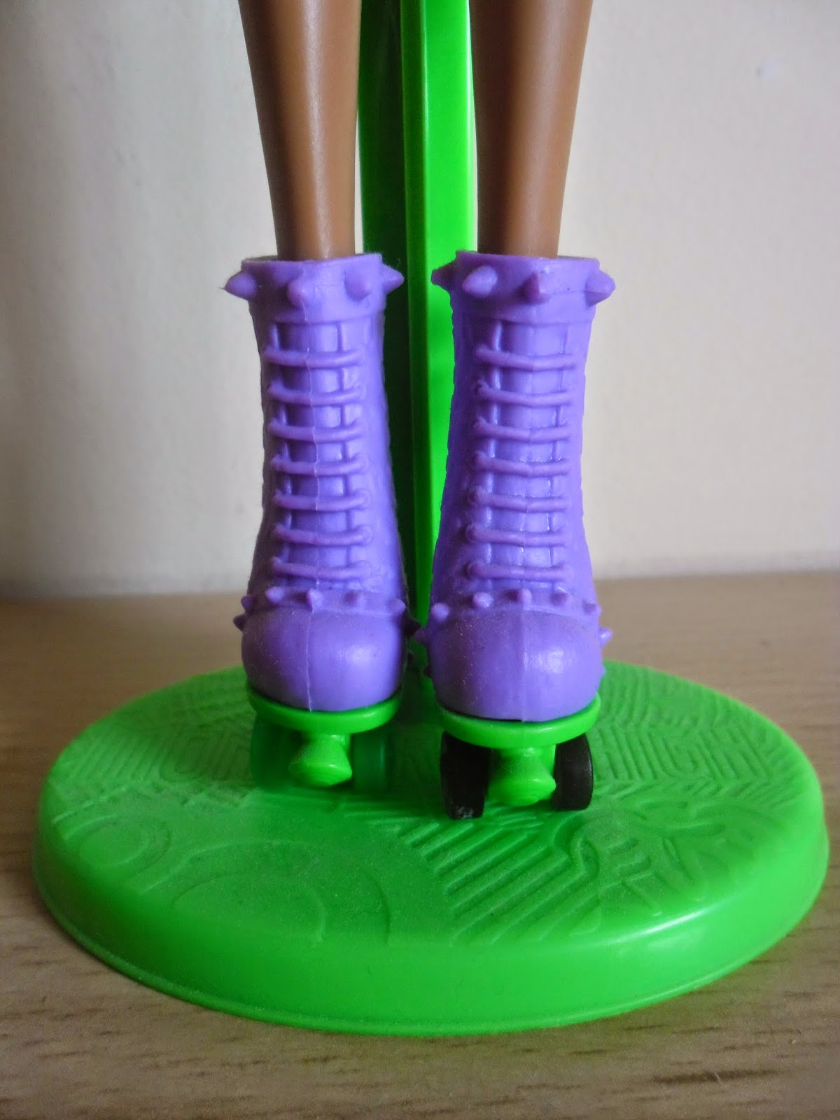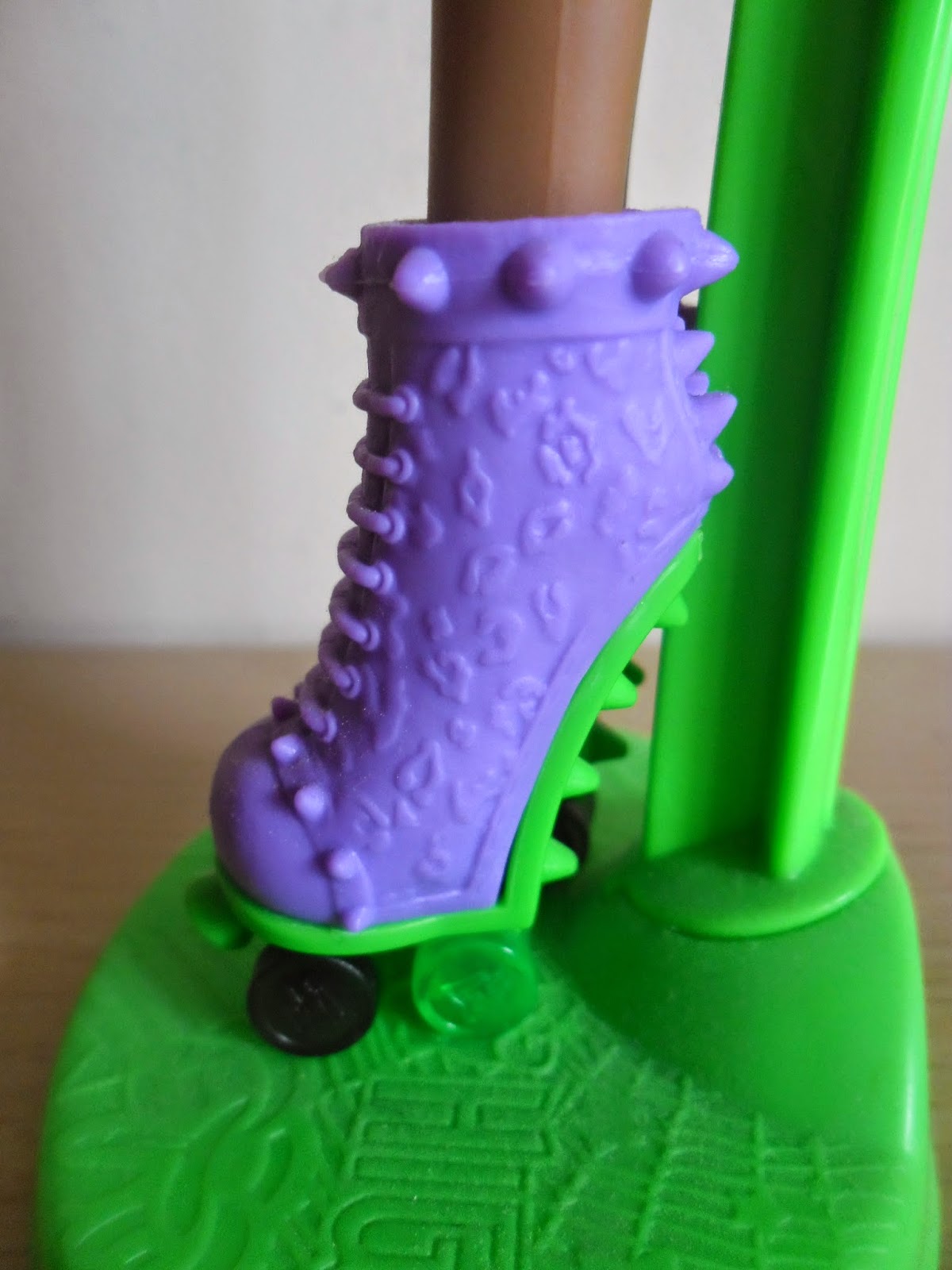 Sus patines son morados,con pinchos y estampado de leopardo en relieve.En la parte trasera tiene más pinchos y las ruedas se pueden mover de verdad.