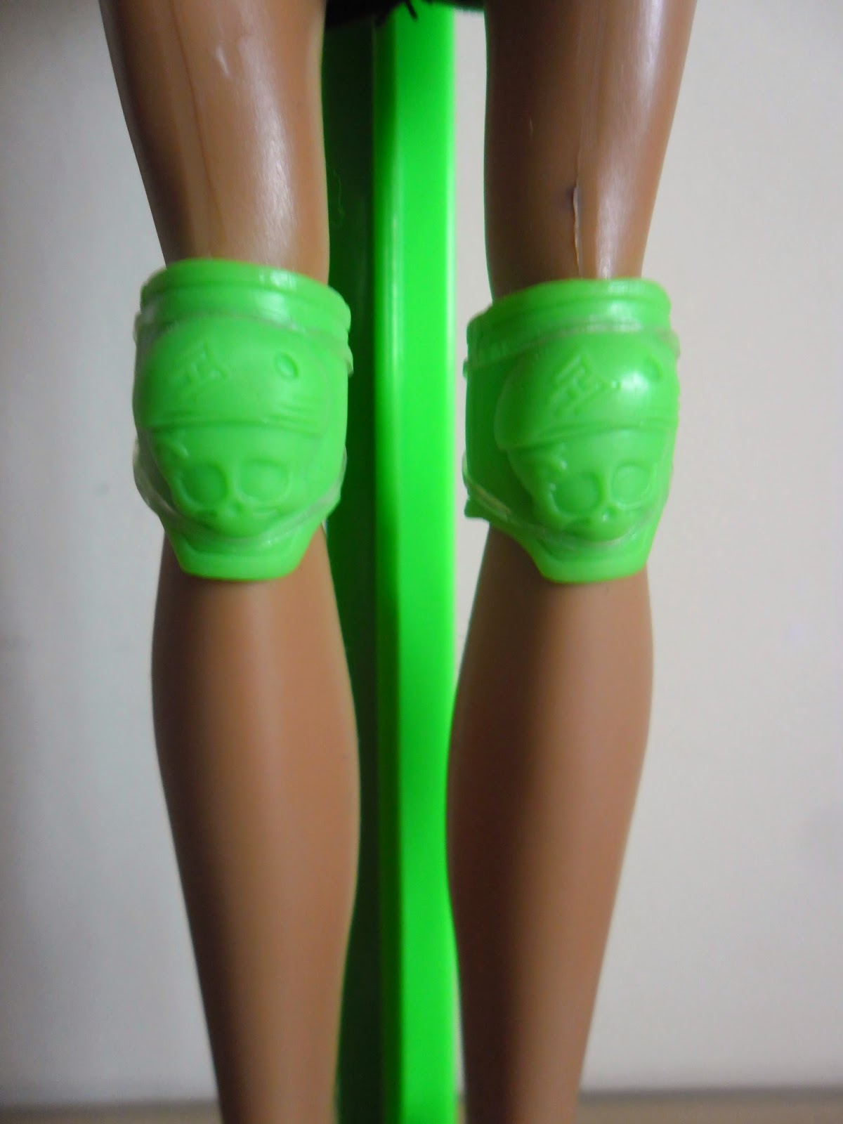 Sus rodilleras protectoras son verdes y tienen una calavera del emblema de Monster High con un casco en relieve.