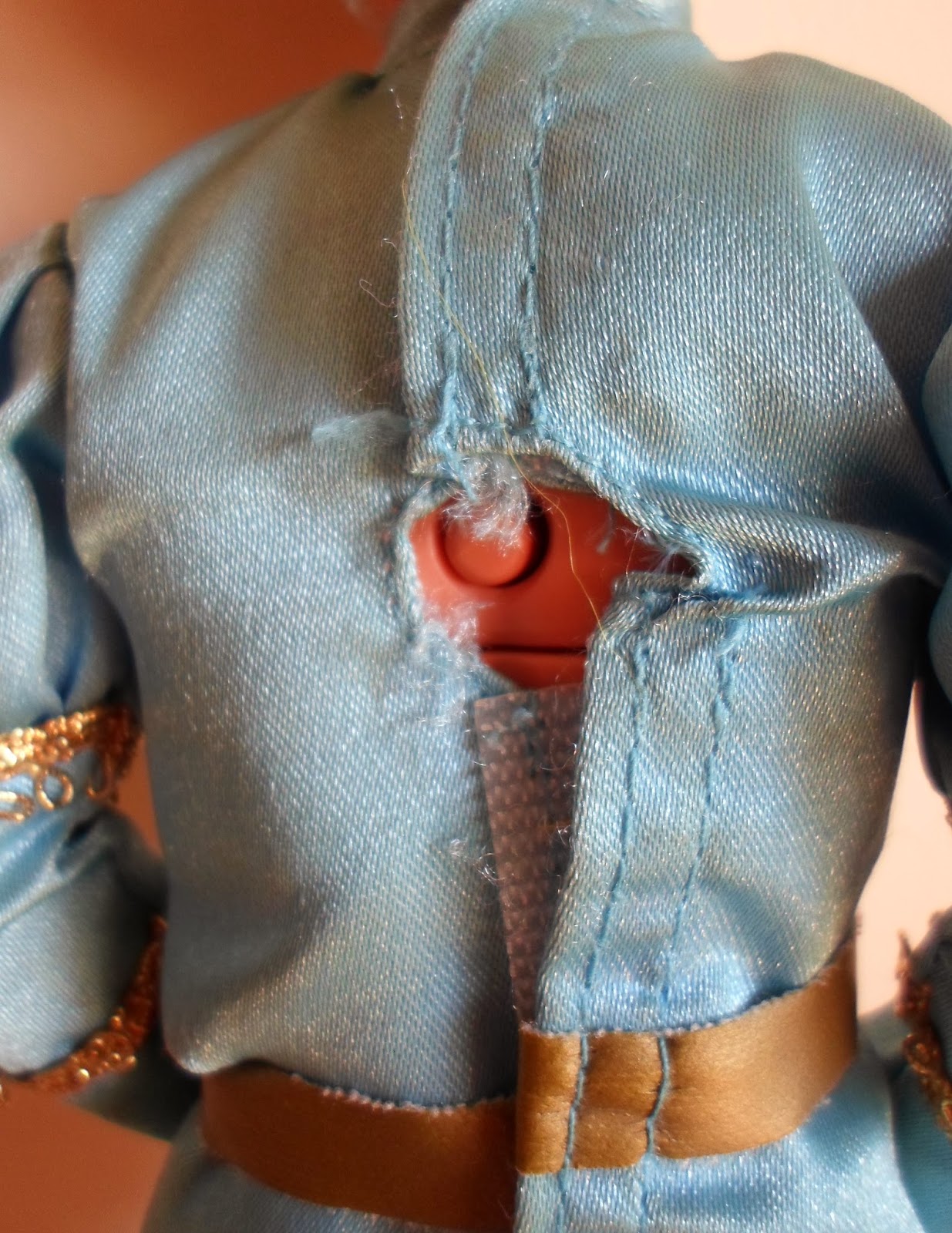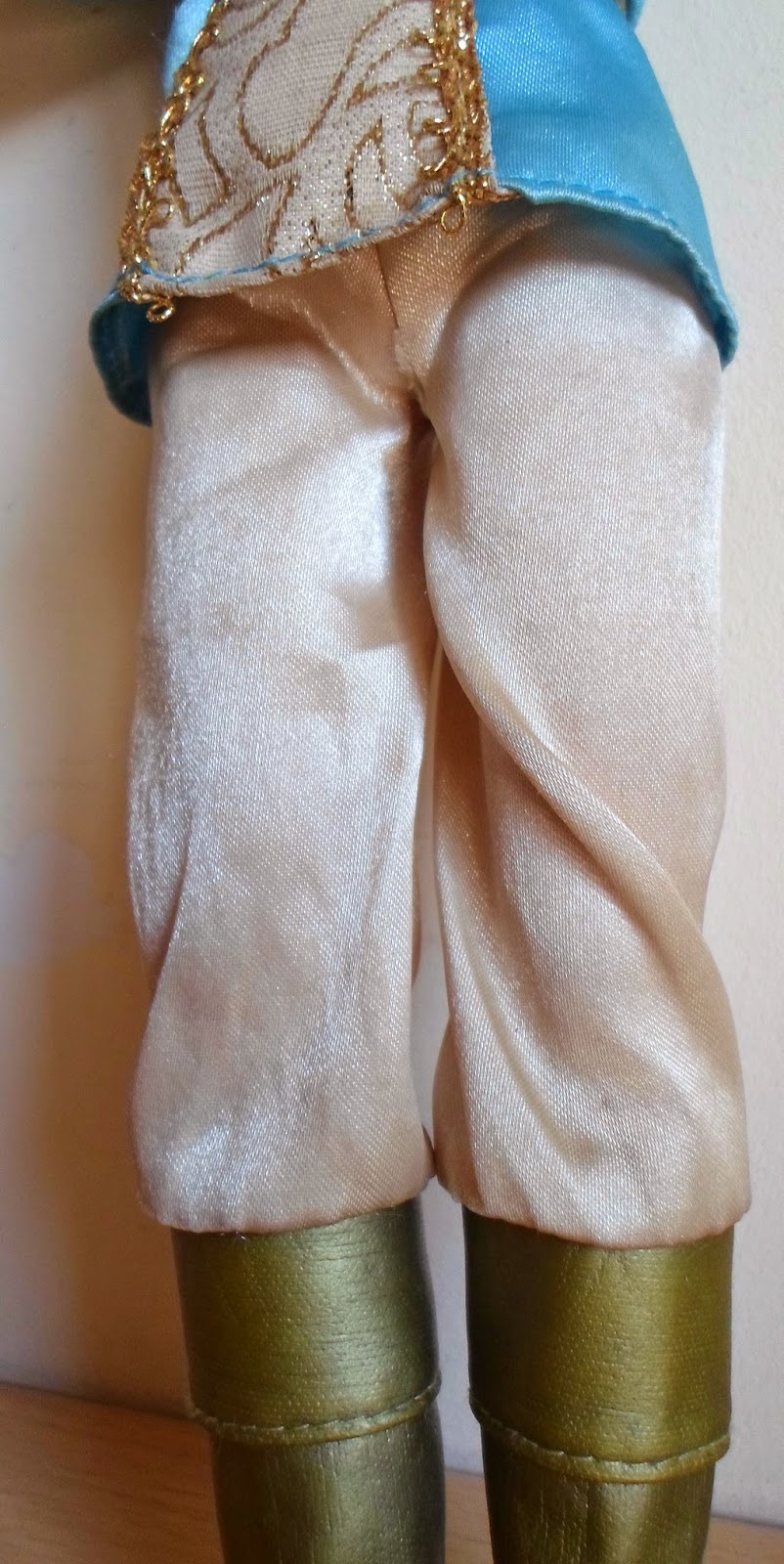 Su camisa es lo mejor y lo que más destaca.Ese precioso azul cielo(quizá un tono más oscuro),es perfecto,y que después se combine con la ornamentación de la tela beige(aunque con los años de a vuelto casi de color gris), y los trazados con hilo dorado, aparte de las tiras alrededor y también en los brazos quedan estupendamente bien. También tenemos un cinturón de color polvorón(me lo acabo de inventar pero es que se me parece mucho a el color de los riquísimos polvorones de chocolate).
