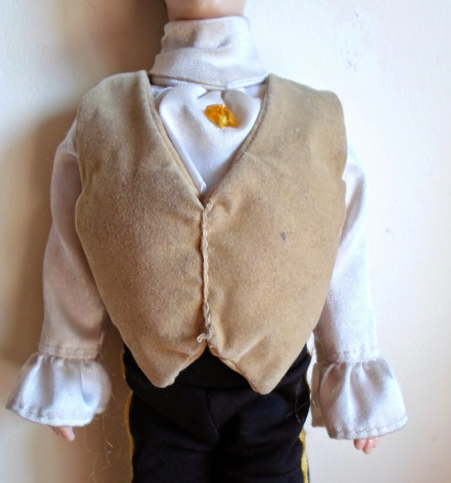 En el torso luce una camisa blanca elegante de cuello alto con las mangas en forma de campana y por encima un (¿chaleco?) de terciopelo marrón muy muy suave.