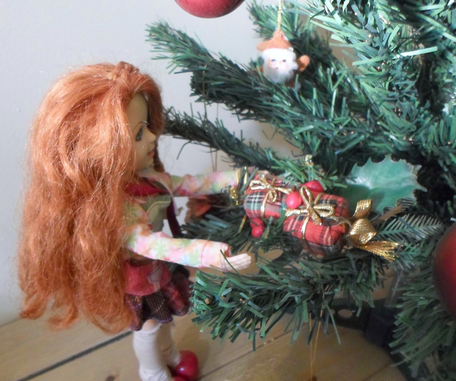 Saltan hasta el árbol y se van repartiendo:mientras yo les paso de vez en cuando alguna bola o adorno,ellas lo cuelgan.