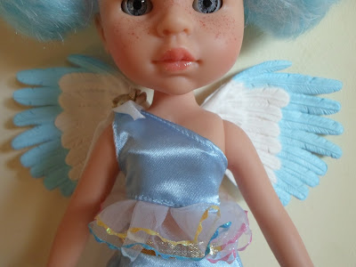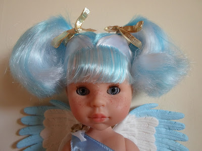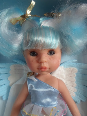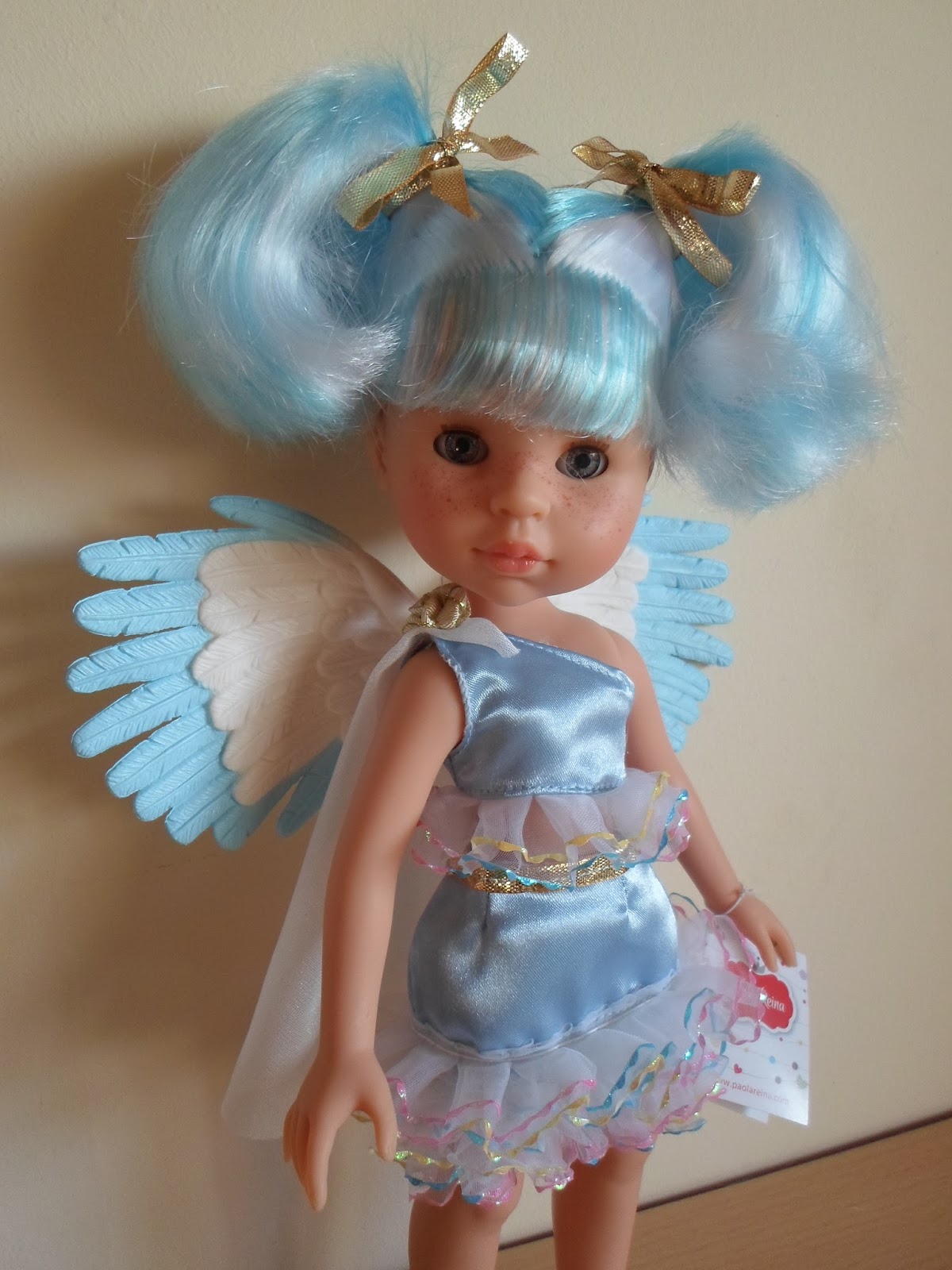 Sus alas son una maravilla. Son de goma, flexibles pero a la vez resistentes y duras. Las plumas interiores son blancas y las exteriores azules, y están muy detalladas. Su pelo es de distintos colores: azul cielo y grisáceo (es difícil de definir porque está entre el gris, el blanco...), recogido en dos coletas altas por dos grandes lazos dorados. También luce un gran flequillo que le tapa las cejas. Su cara es un amor. Con una barbilla marcada, una adorable boquita de piñón, una graciosa nariz y unos preciosos ojos azules envueltos en muchísimas pecas que me encantan, se ve que están hechas con técnica de soplado.