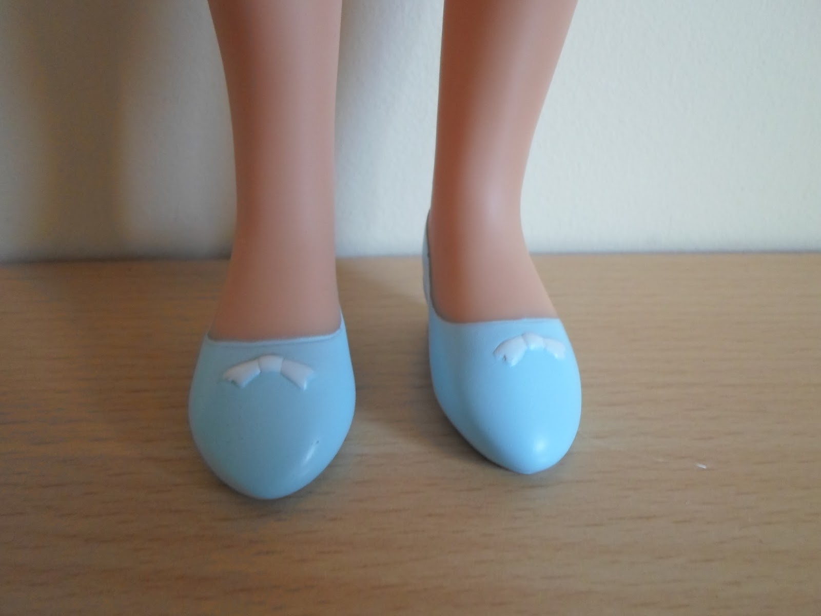 Los zapatos no son reales, están moldeados y pintados al cuerpo. Son de tacón bajo, de un azul cielo muy bonito, con un gracioso lazo blanco en la zona del empeine.
