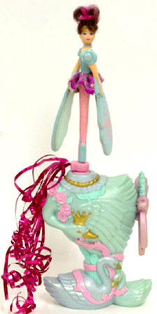 Las muñecas siempre venían acompañadas por una peana decorada en relación con la temática del modelo. La función de este elemento no solamente era sostener a la muñeca, sino que, al tirar de la cuerda que incluye en uno de los laterales, la muñeca, que cuenta con unas alas de espuma, sale despedida hacia arriba mientras sus alas giran como una hélice; dando la sensación de que es capaz de volar.