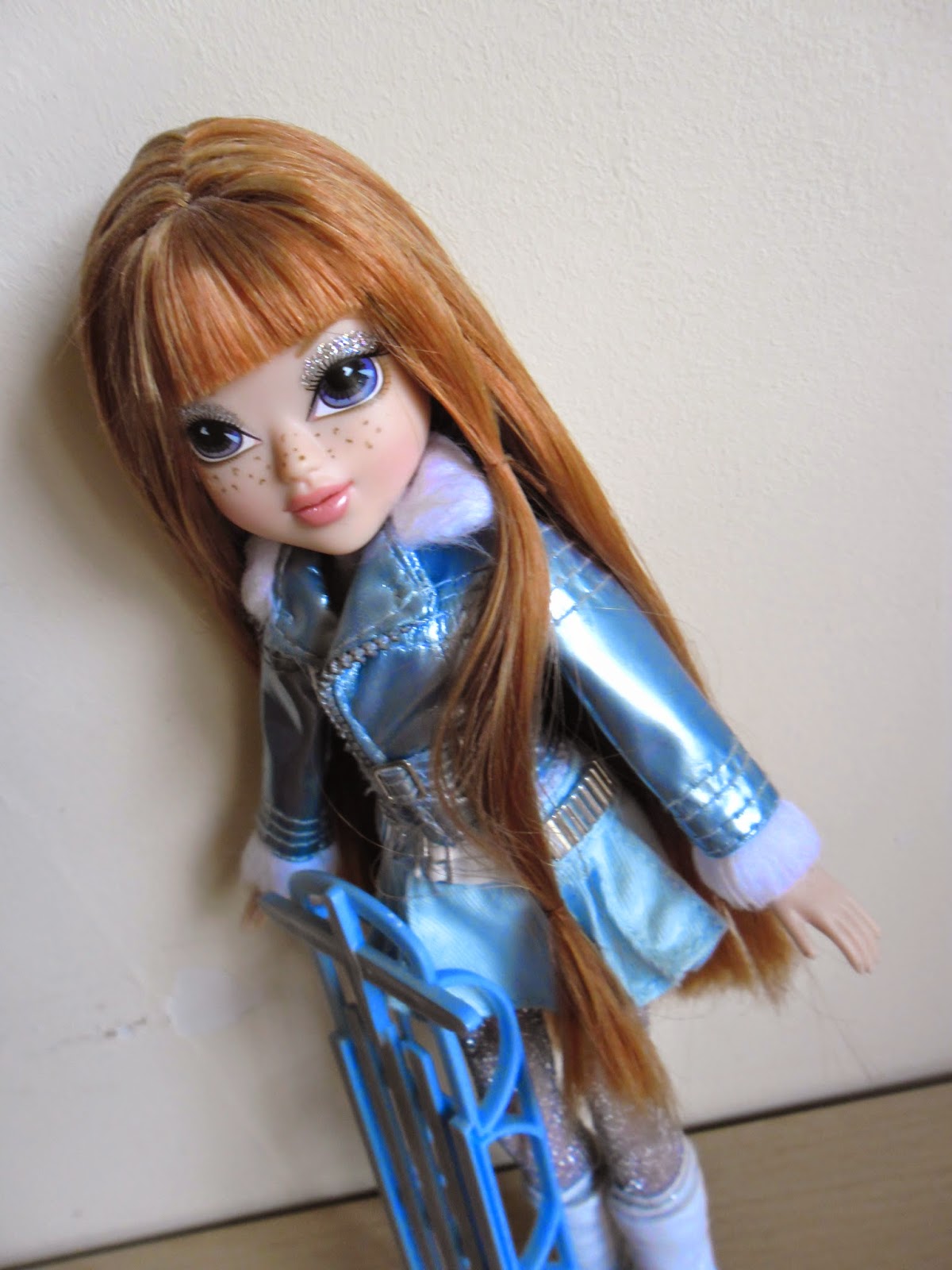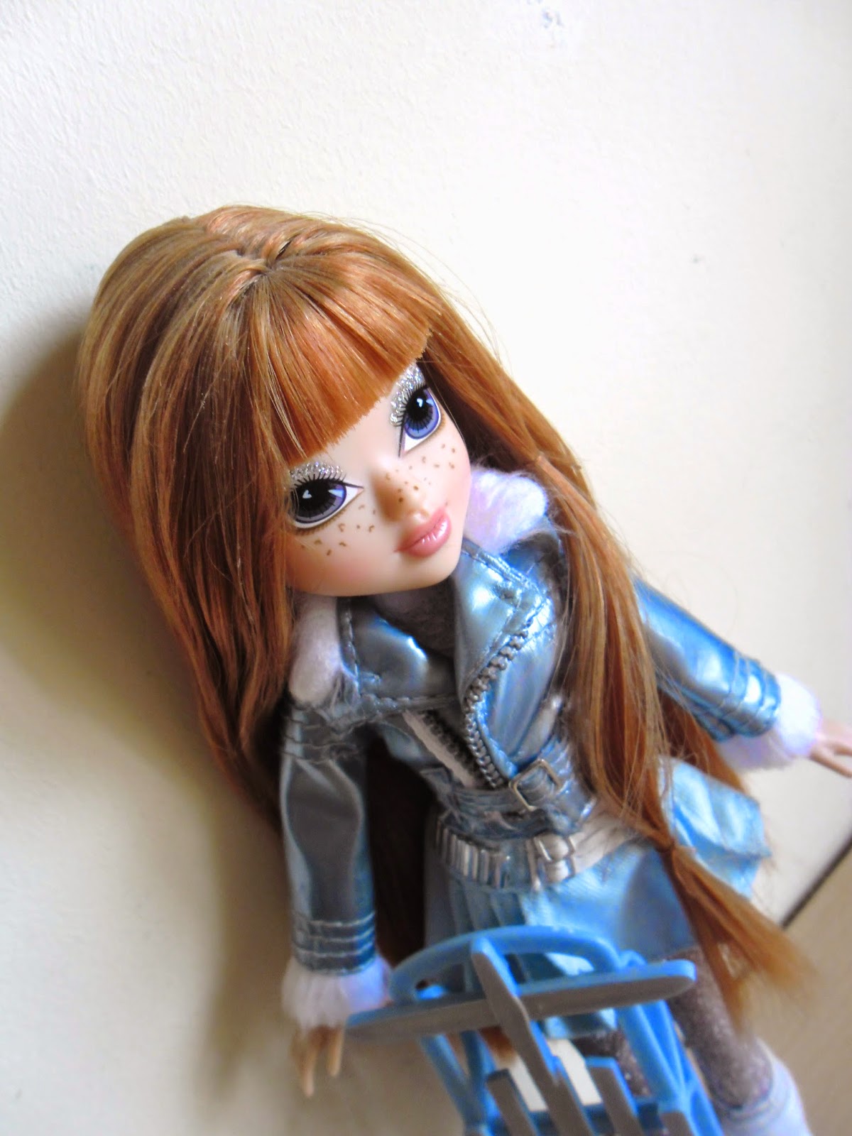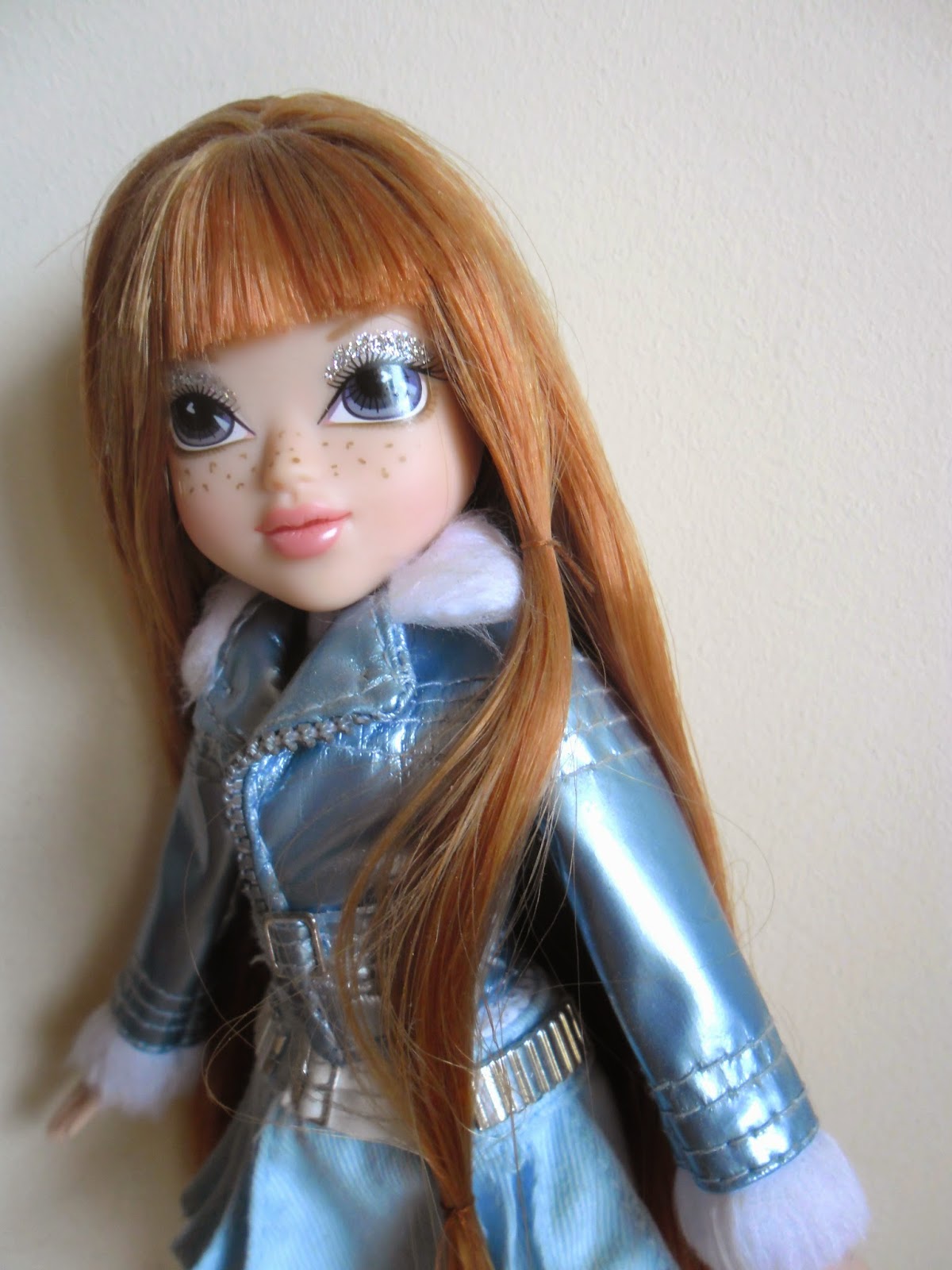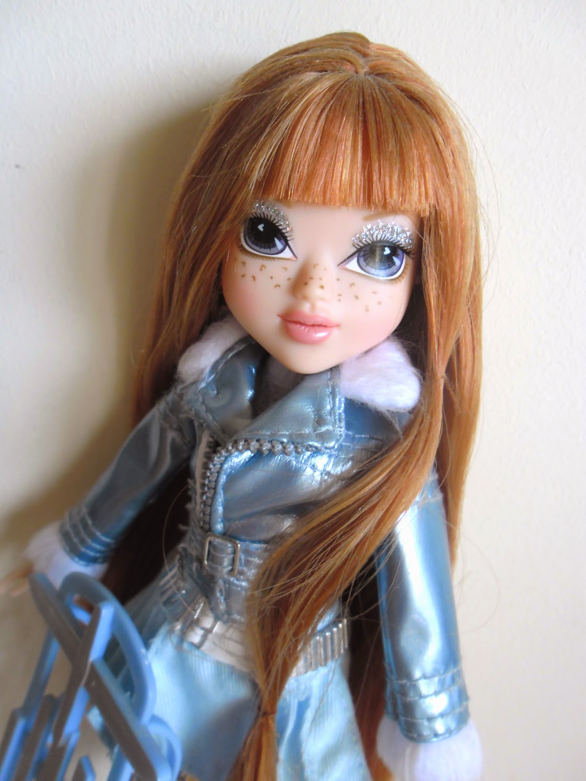 Sus labios no van pintados(como en todas los modelos de Moxie Girlz),y sus preciosos ojos con destello en forma de corazón tienen una sombra de ojos plateada con purpurina.Kellan es mi personaje favorito de toda la línea(a parte de Bria),por su color de pelo y esas pecas tan adorables.