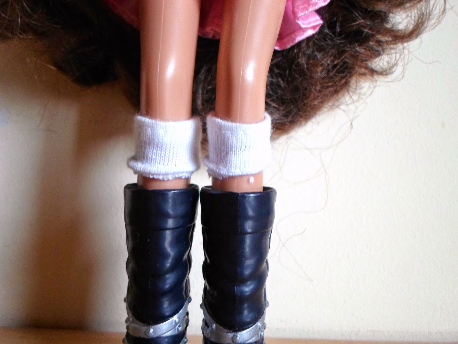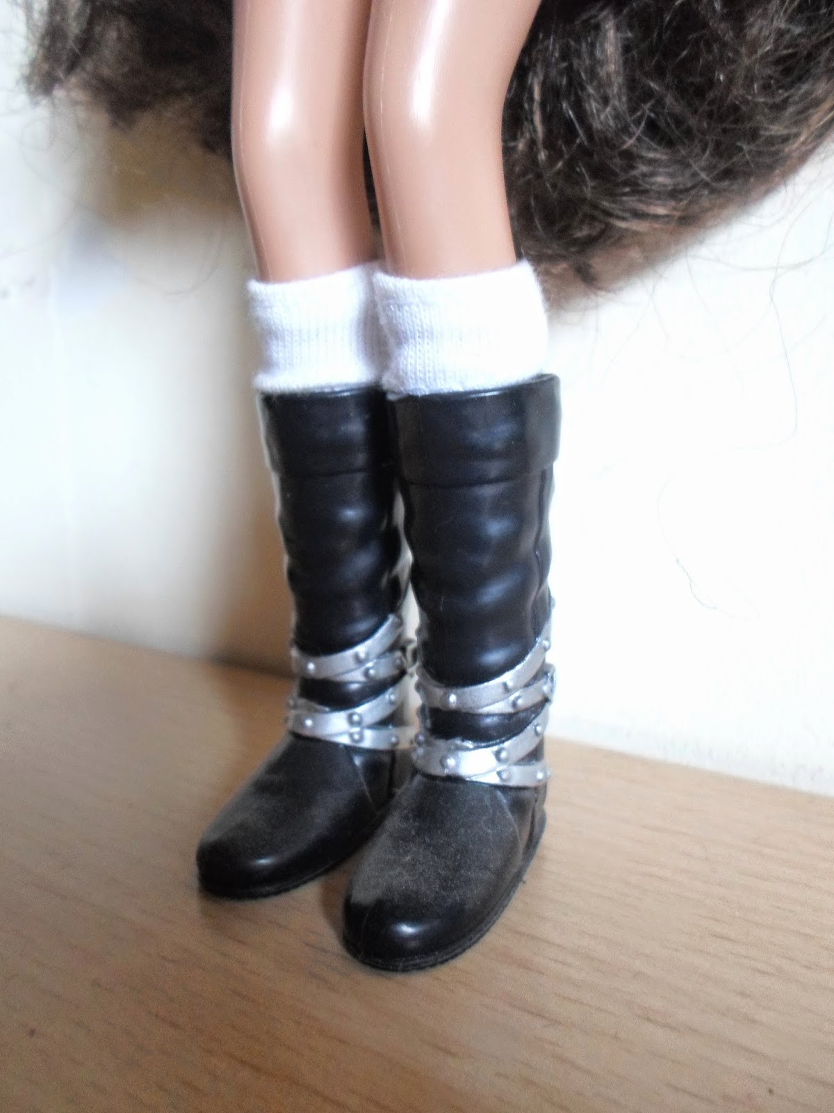 Sus botas son altas y blancas,con las tiras con tachuelas celestes.