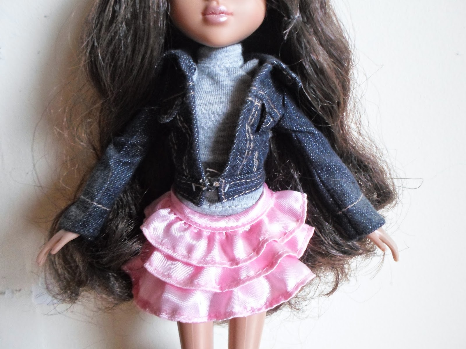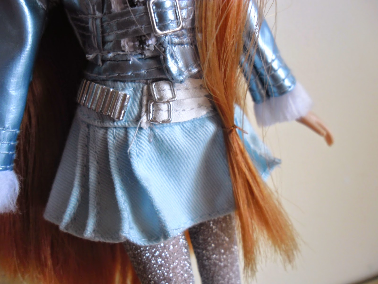 Su falda es de color celeste,corta y con diferentes cinturones que no llegan a tocarse.Uno es doble.