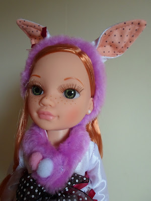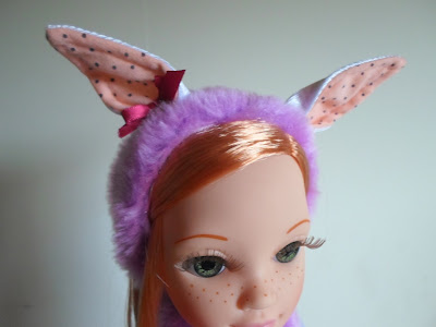 En la cabeza tiene una diadema de la misma tela taaaaan suave de la bufanda, con dos graciosas orejas de conejo que son blancas por fuera y rosas con topos negros por dentro, con un lazo rojizo. En resumen, son una cucada: ¡me encantan!