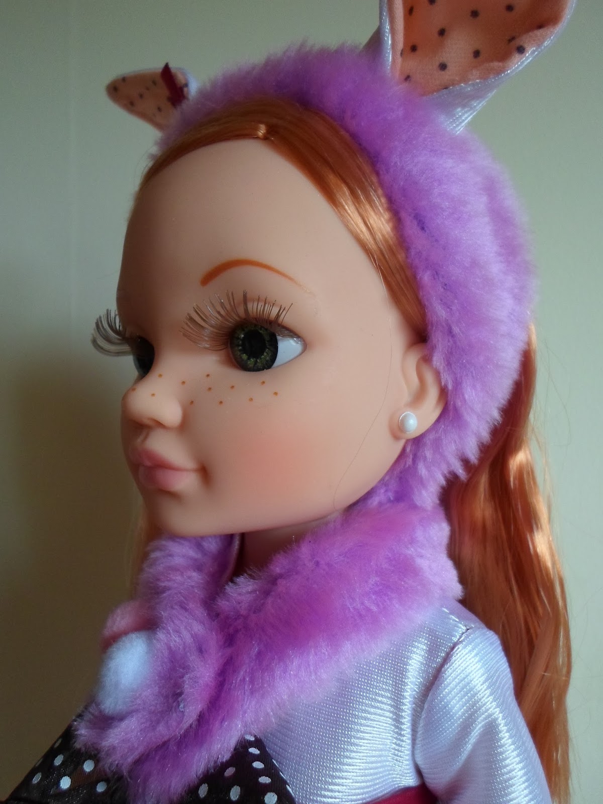 Su vestido es corto y abultado, por la capa que tiene debajo que le da un poco de vuelo. La falda es de color granate y está recubierta por otra capa de la misma tela (raso), de color blanco. Encima tiene un bordado de color rojo, a modo de cenefa, y unos adhesivos con el logo de Nancy y el conejito que la acompaña (¡me encanta!). El vestido es de manga larga y debajo del pecho encontramos un gran lazo de color negro con topos blancos. Justo encima hay una bufanda muuuuuuuy suave de color lila con dos "pompones" de color rosa y blanco.