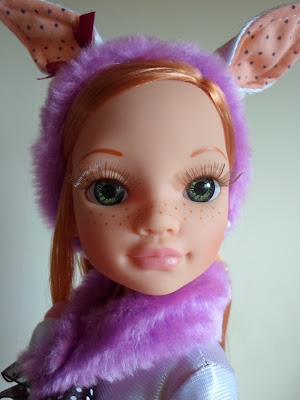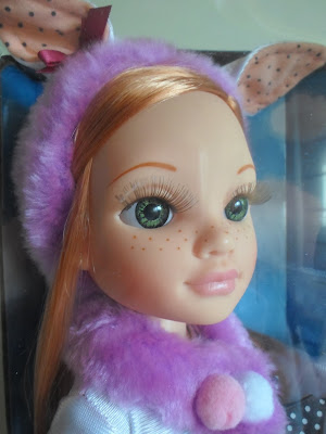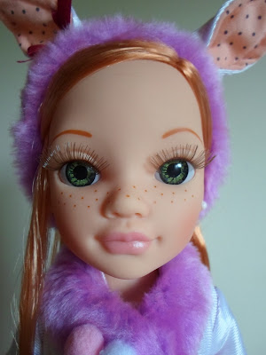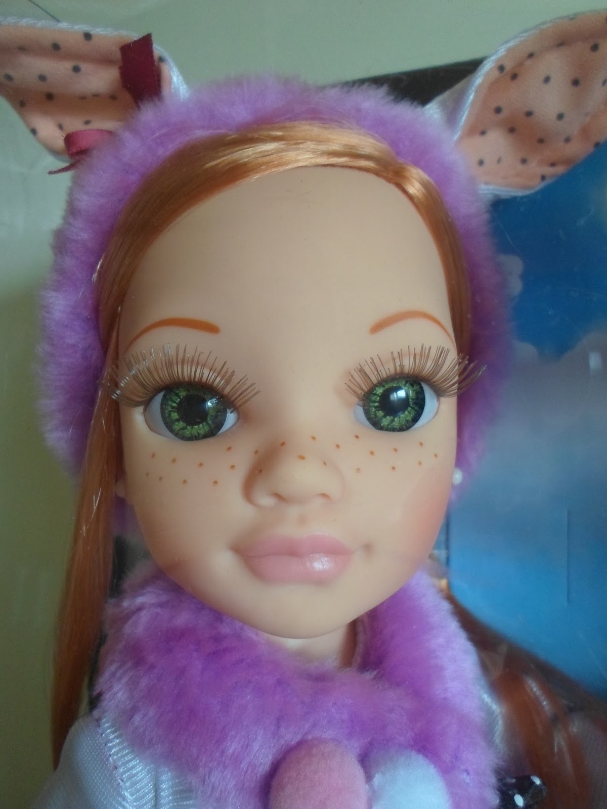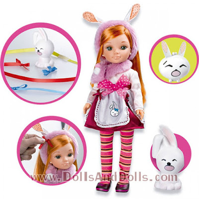 Como veis, hay cierta diferencia entre el prototipo y la muñeca final: el trazo de las cejas es distinto, y los labios tienen un tono carnoso, en vez de rosado. Con el tono de color carne se la ve más infantil y delicada, pero con los labios más colorados también está guapísima. Incluye un conejito de goma (ideal para que los niños se bañen con él), un monedero también de forma de conejito, y unas cintas de colores que están ideadas para convertirse en lazos.