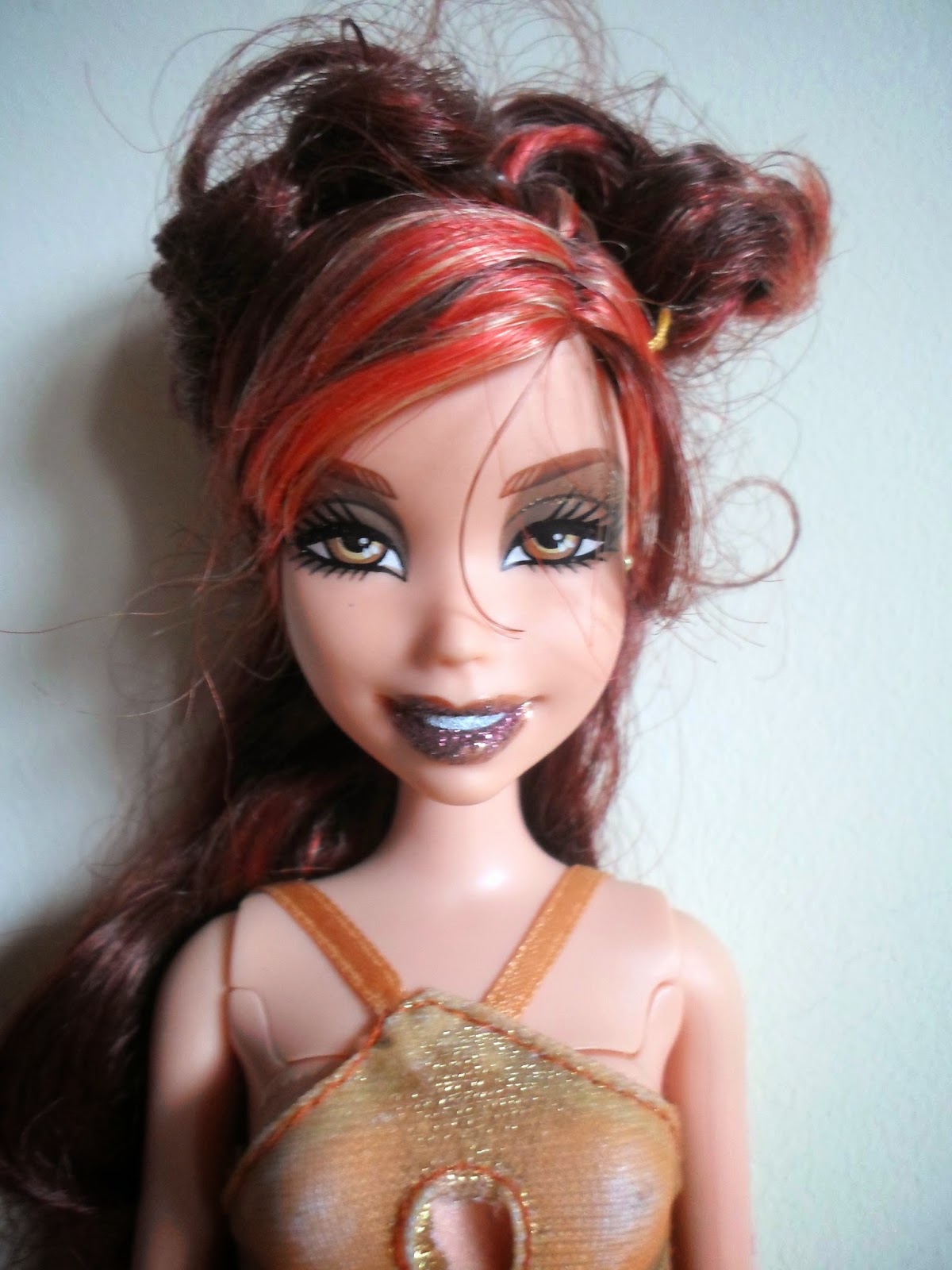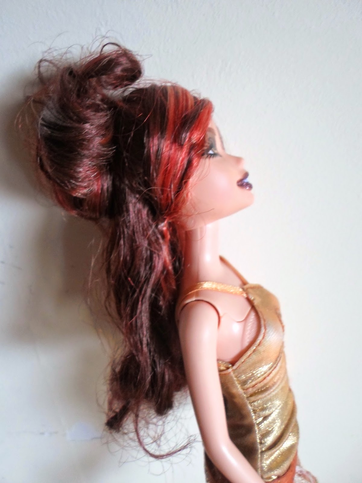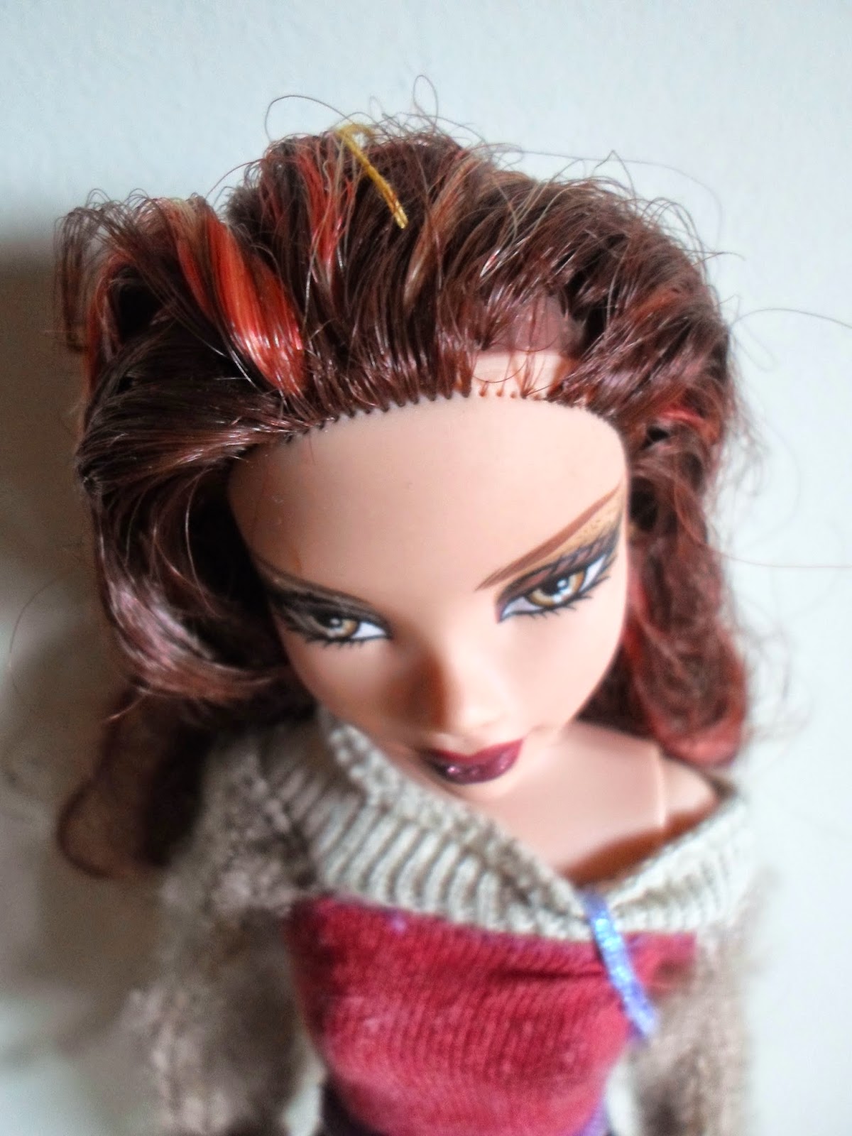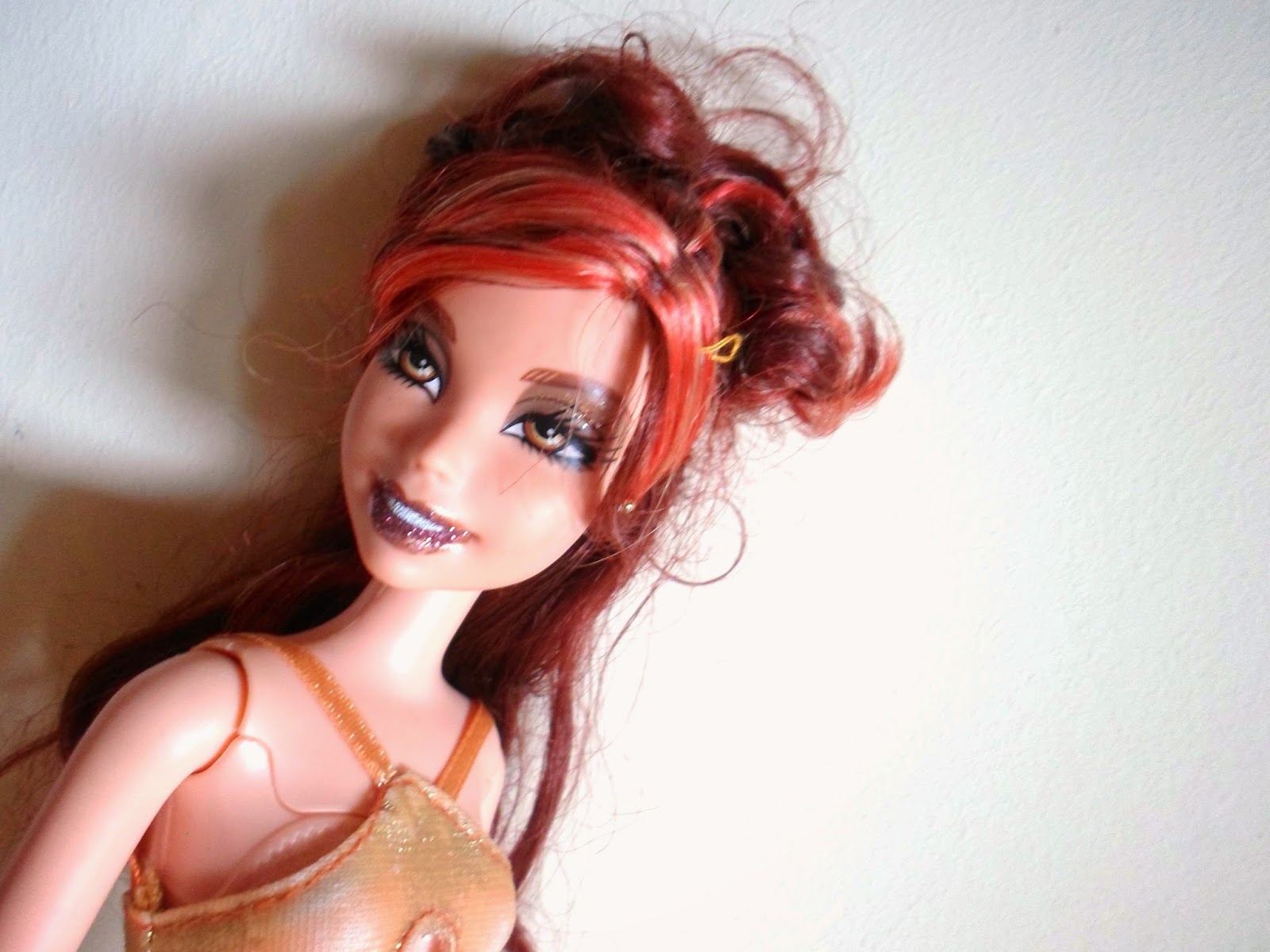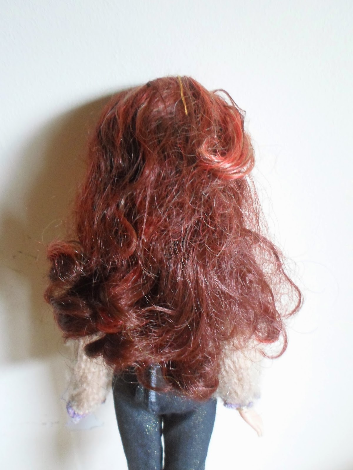 El pelo es pelirrojo(me encanta las muñecas pelirrojas,tanto si el pelo es rojo como naranja),ondulado(y enredado),y tiene mechones con mechas de un color más vivo.