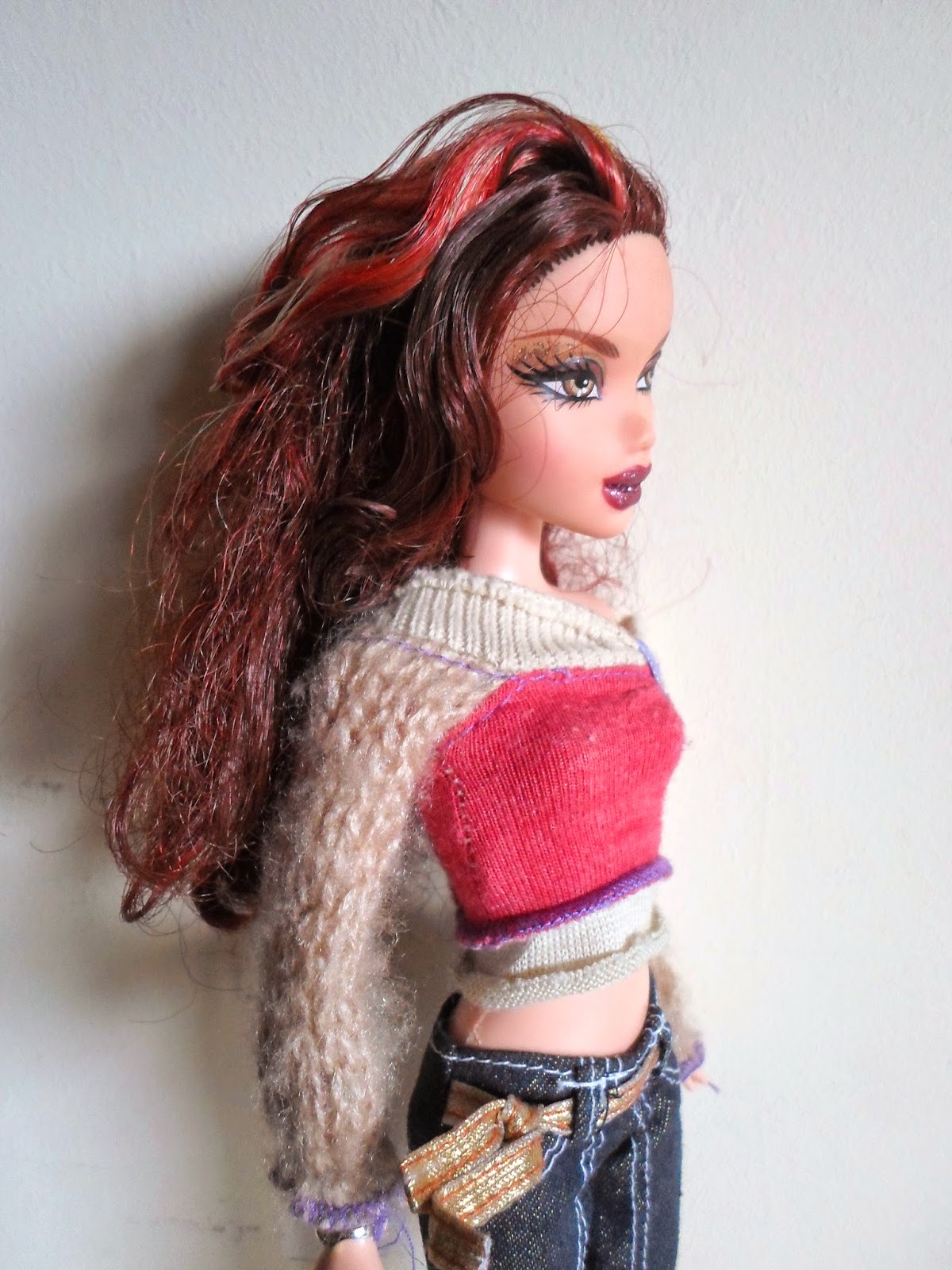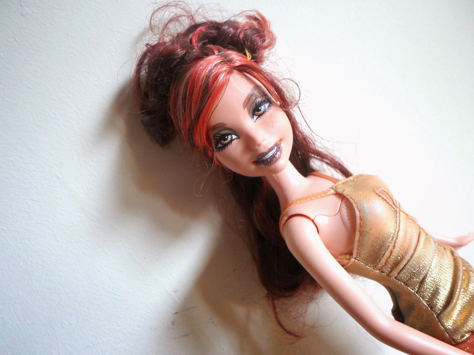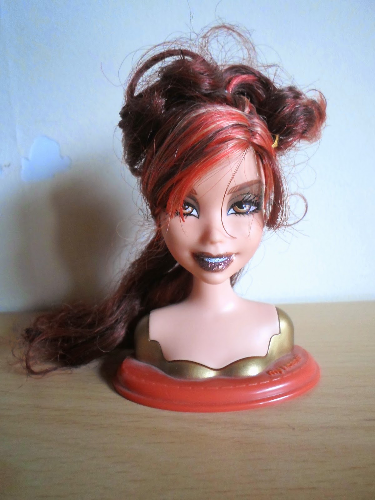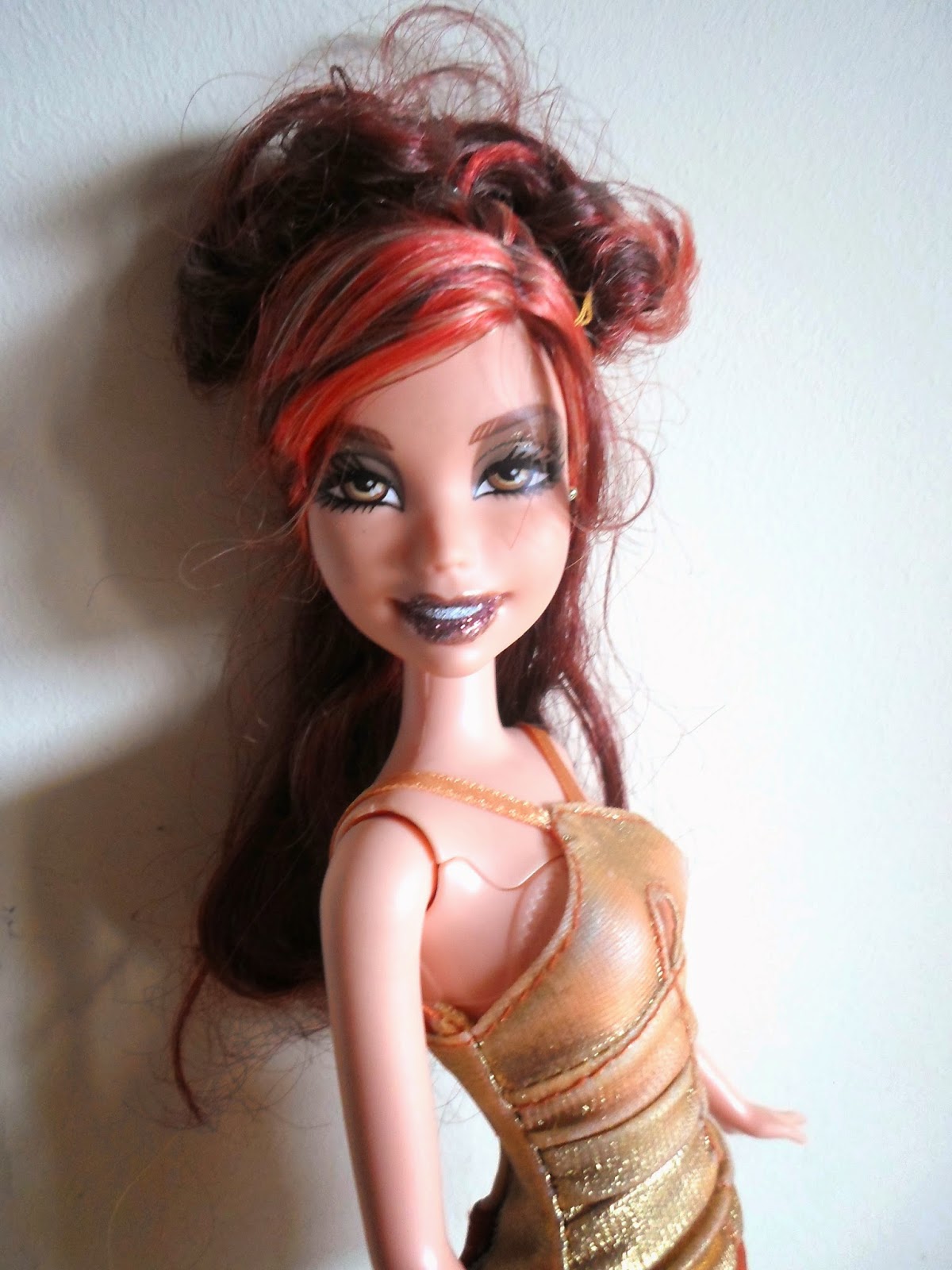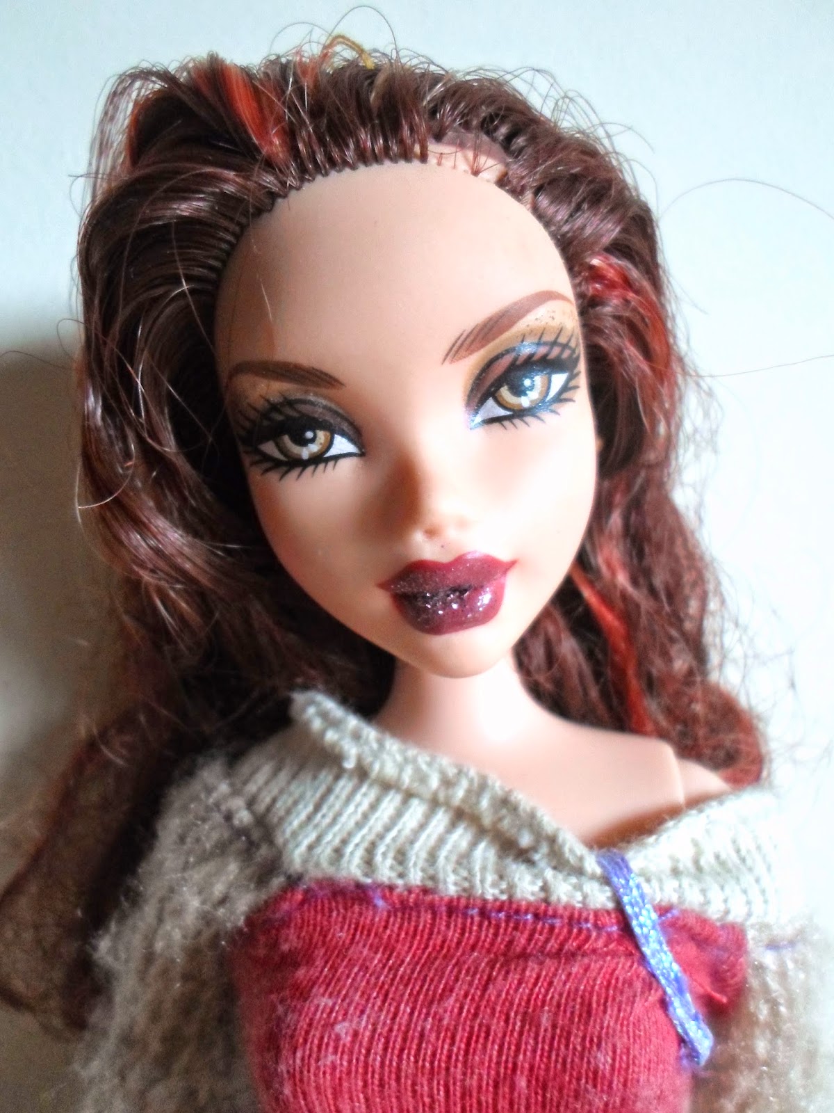 El pelo es pelirrojo(me encanta las muñecas pelirrojas,tanto si el pelo es rojo como naranja),ondulado(y enredado),y tiene mechones con mechas de un color más vivo.
