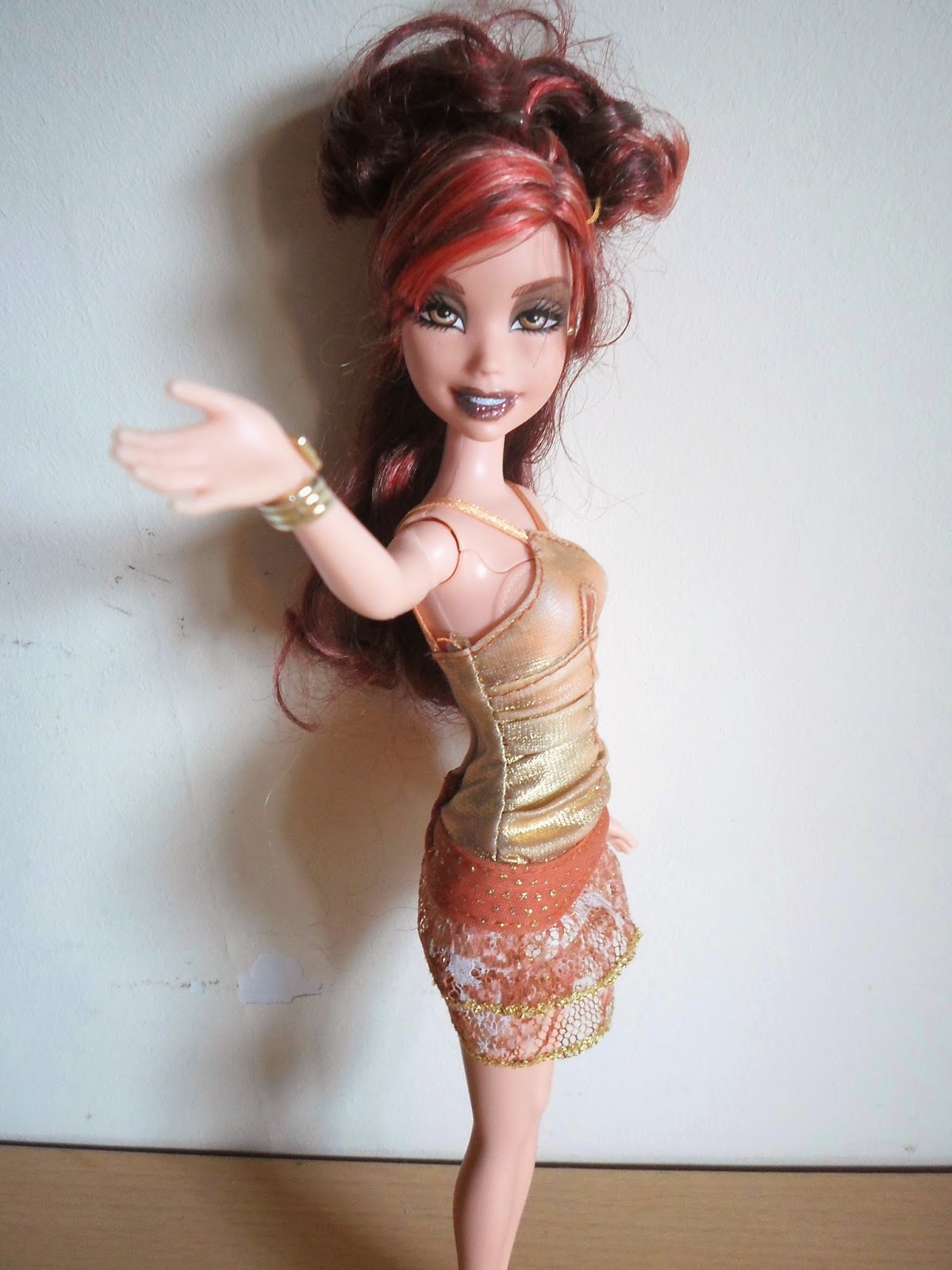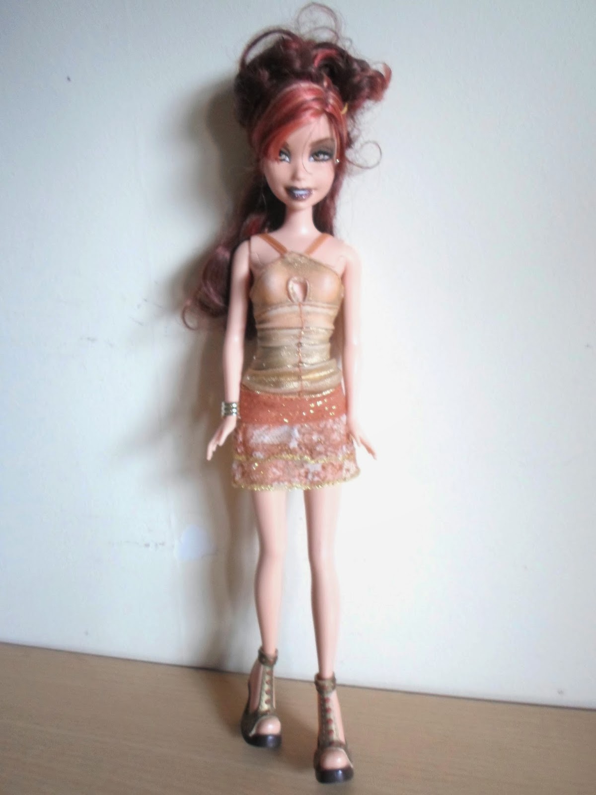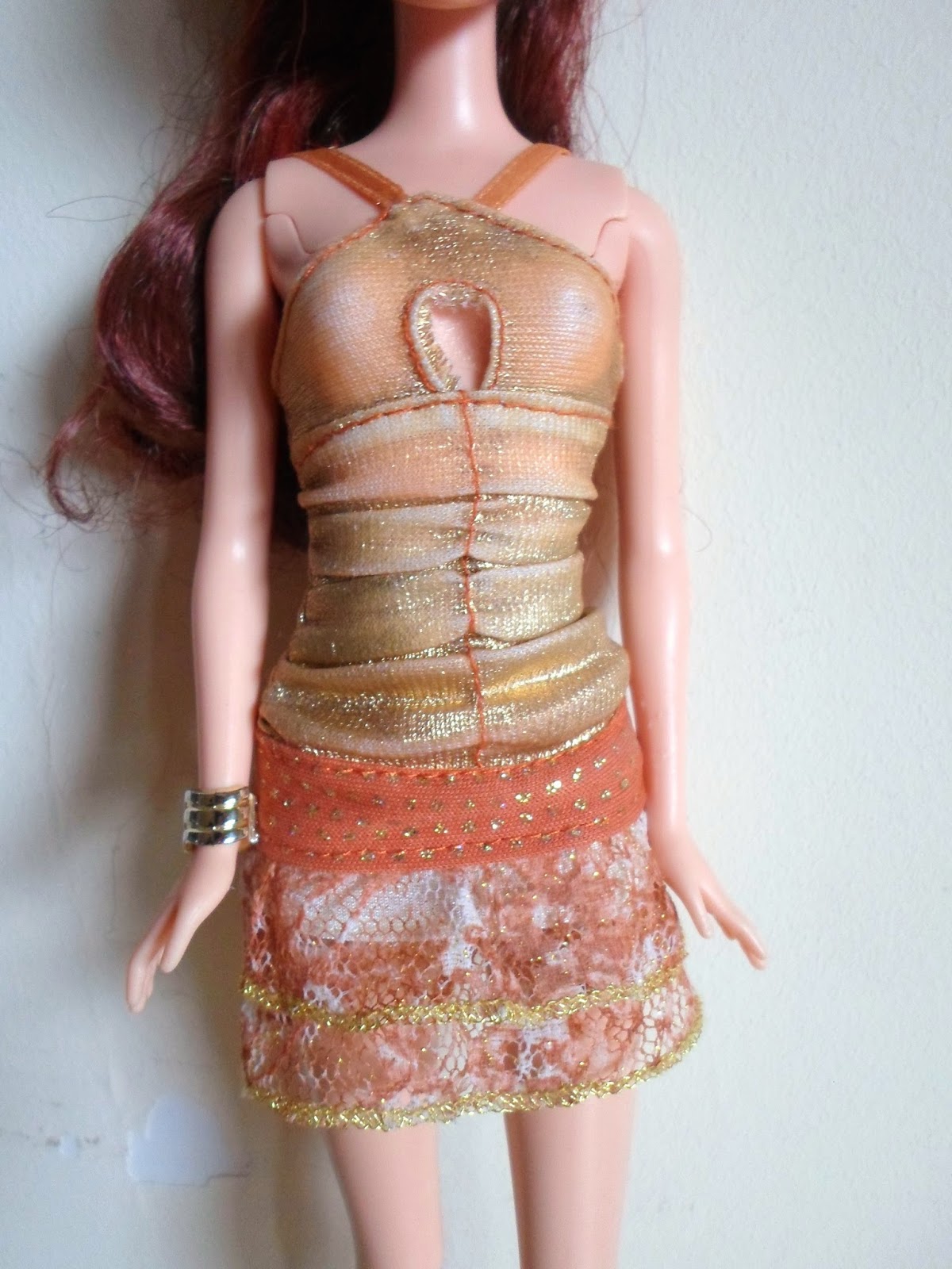 El vestido es precioso.De color dorado y naranja.La falda está tejida por un tul muy fino naranja y blanco que forma un dibujo .Los bordes finales de las dos capas de falda están cubiertos por purpurina dorada.Hay una especie de cinturón naranja con hilo dorado bordado.La parte superior es dorada,elástica(me recuerda a la Barbie ochentera con ese body azul y los calentadores,como la de toy story 3),y tiene tirantes marrones que salen del escote que acaba en punta y que tiene una obertura ovalada en el pecho.Como podréis apreciar,la tela se ha descolorido,cosa que me da mucha rabia.Ya leí que en las últimas colecciones de My Scene,Mattel bajó la calidad de los materiales considerablemente,así que,aquí tenemos una prueba...