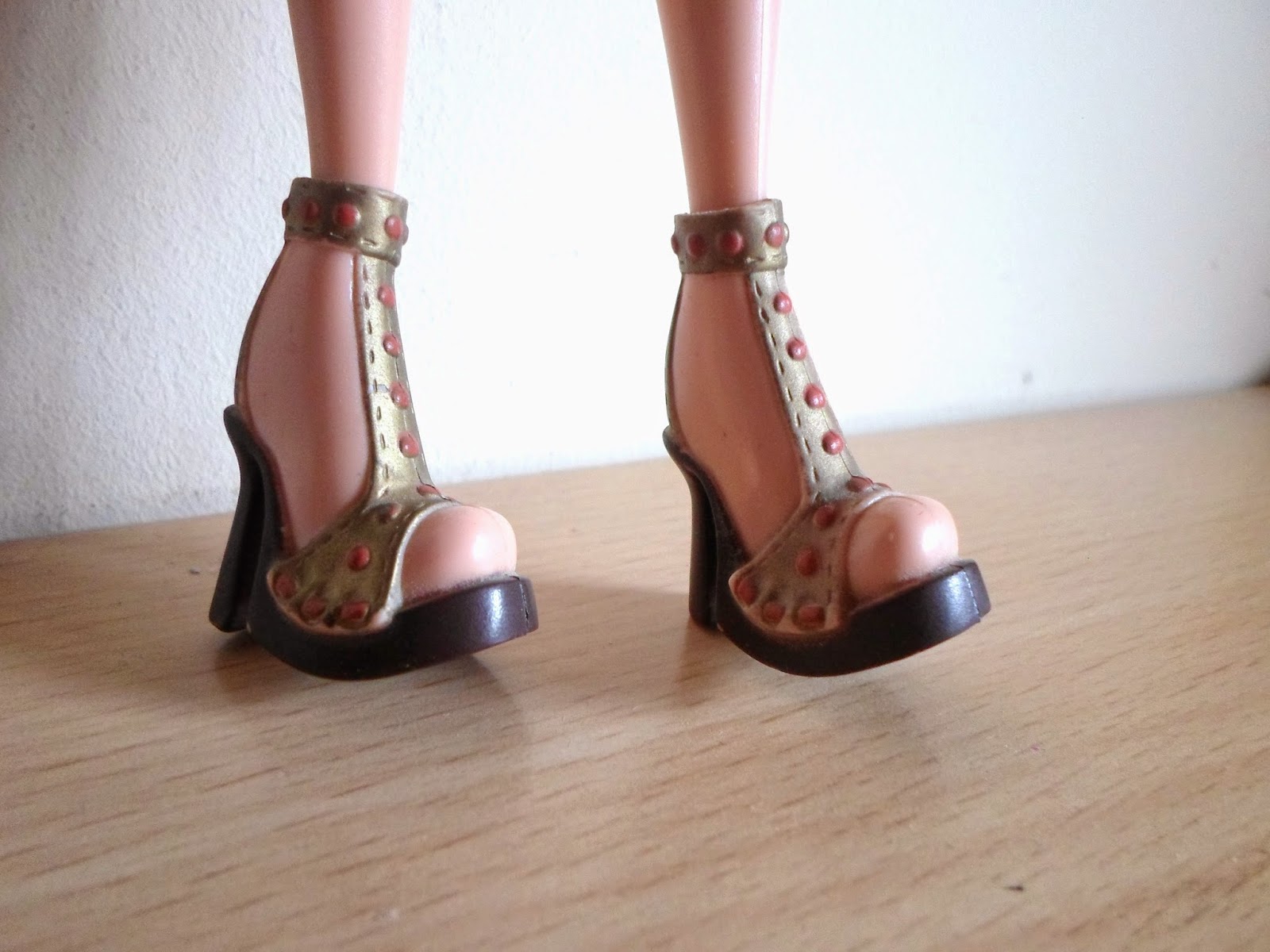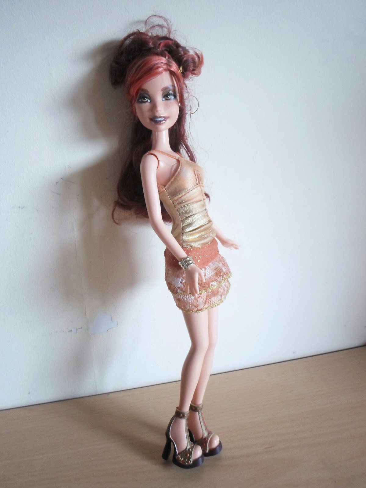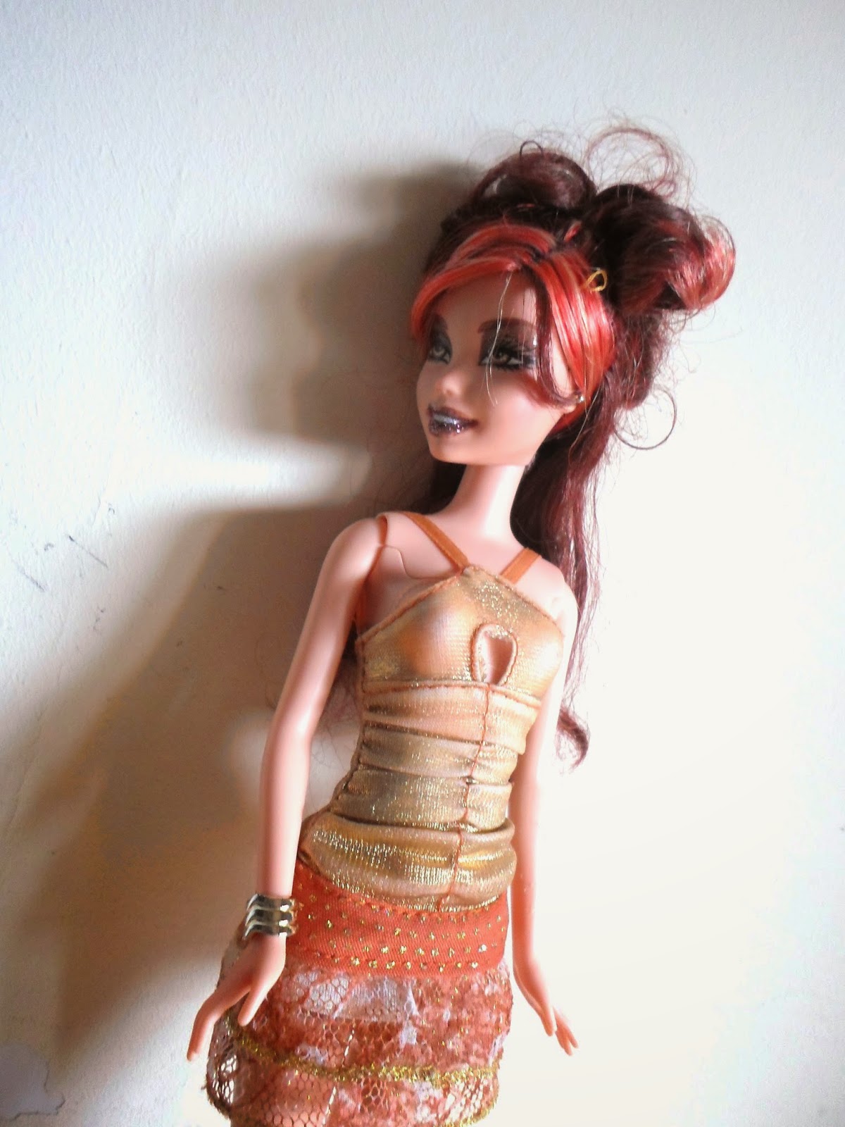 El vestido es precioso.De color dorado y naranja.La falda está tejida por un tul muy fino naranja y blanco que forma un dibujo .Los bordes finales de las dos capas de falda están cubiertos por purpurina dorada.Hay una especie de cinturón naranja con hilo dorado bordado.La parte superior es dorada,elástica(me recuerda a la Barbie ochentera con ese body azul y los calentadores,como la de toy story 3),y tiene tirantes marrones que salen del escote que acaba en punta y que tiene una obertura ovalada en el pecho.Como podréis apreciar,la tela se ha descolorido,cosa que me da mucha rabia.Ya leí que en las últimas colecciones de My Scene,Mattel bajó la calidad de los materiales considerablemente,así que,aquí tenemos una prueba...