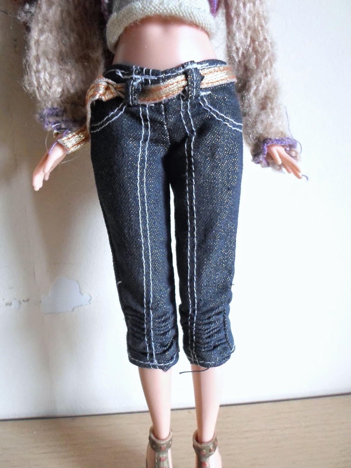 La única ropa original que conserva son los pantalones,así que nos centraremos en ellos:son tejanos,oscuros,prácticamente negros,piratas y con un cinturón de tela de color dorado con hilo naranja bordado.