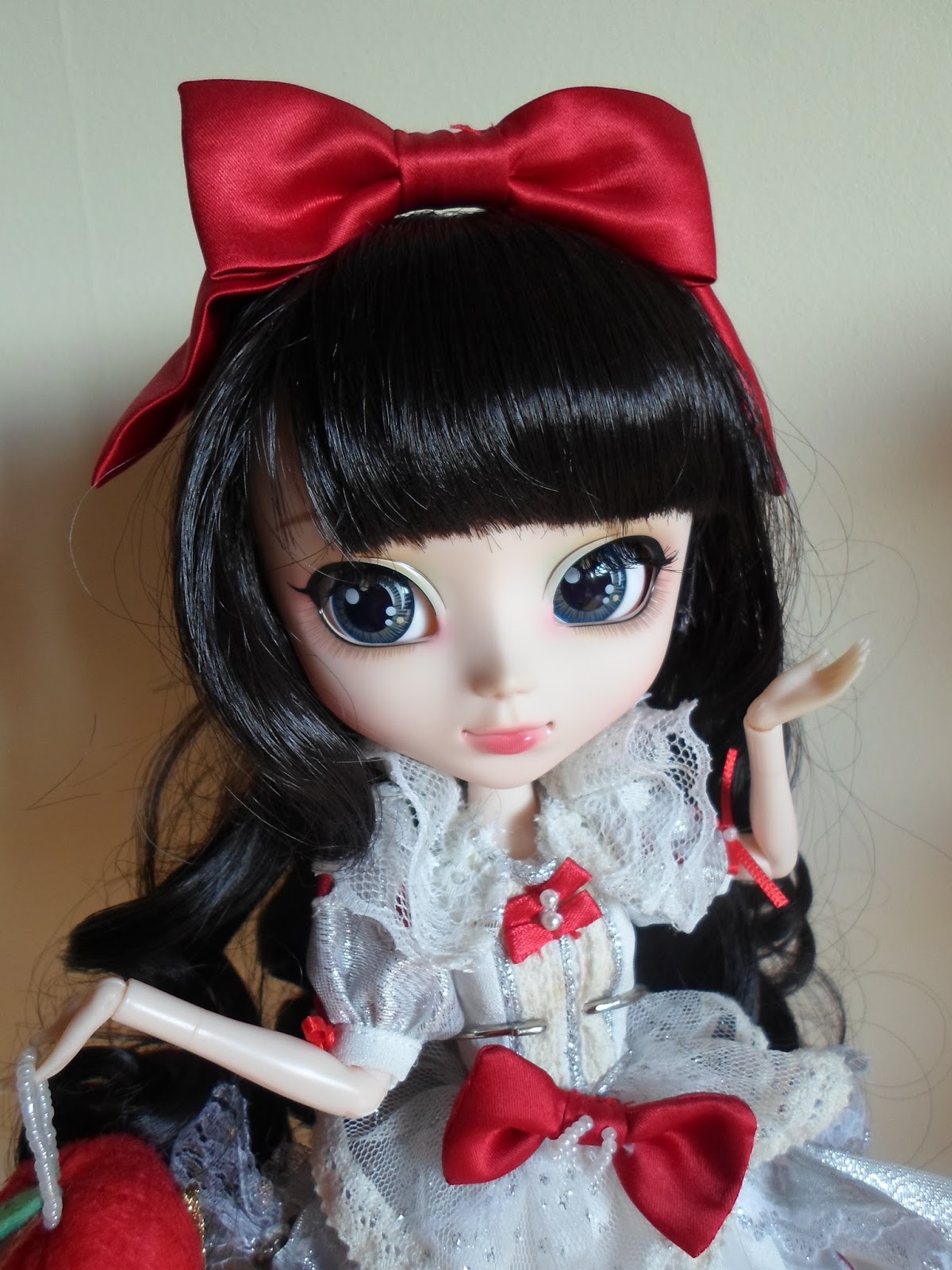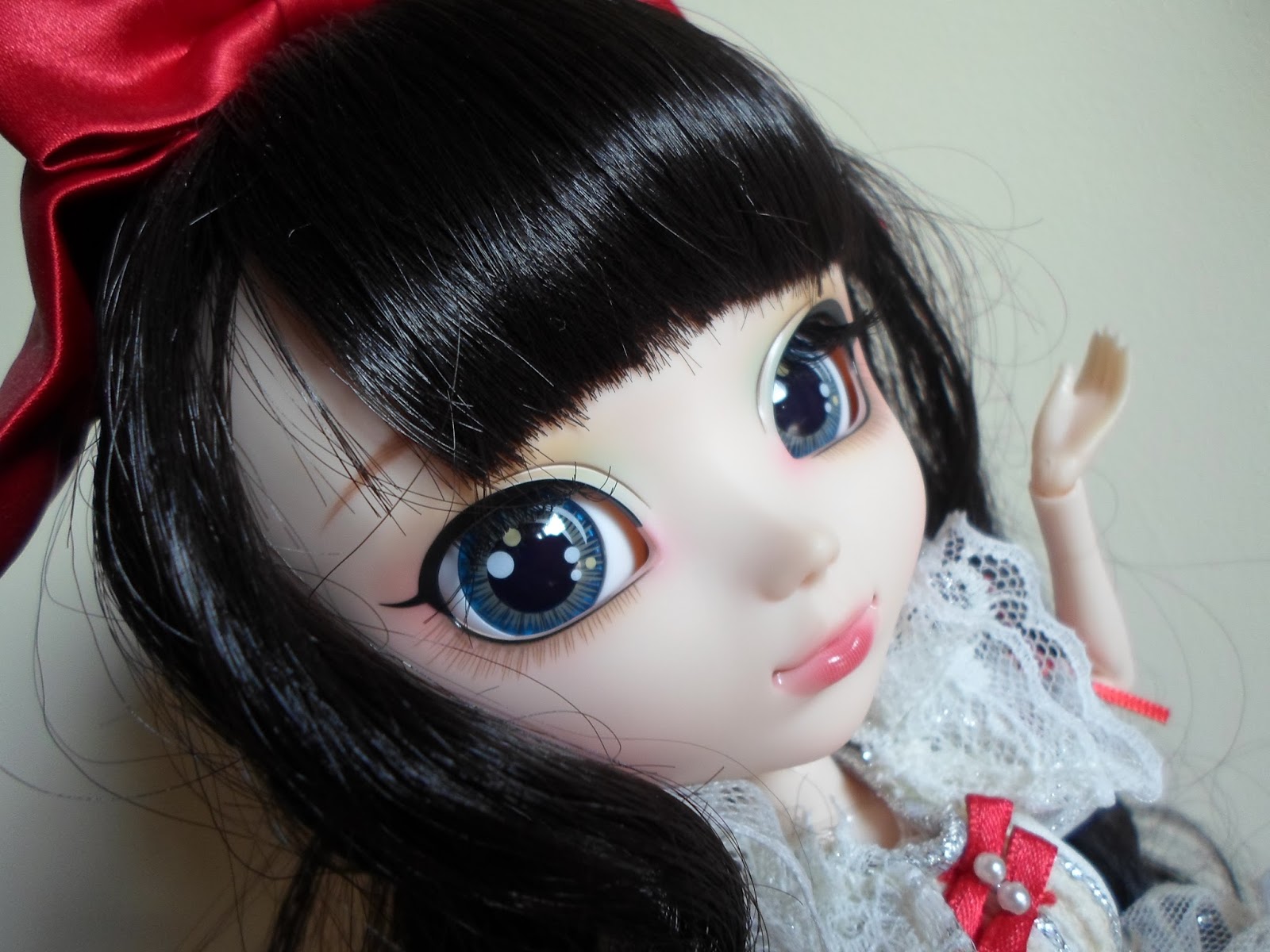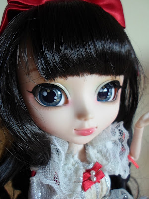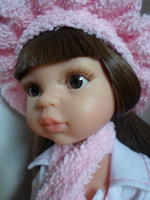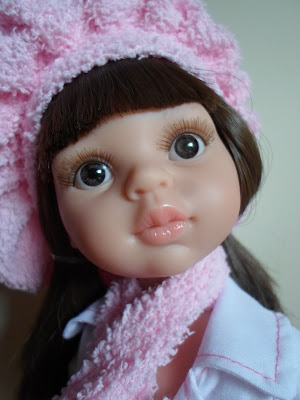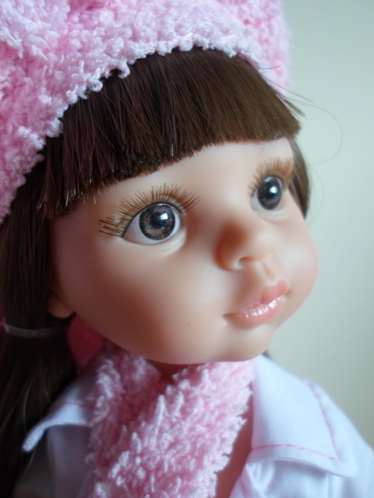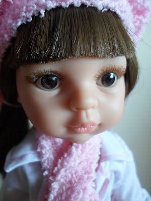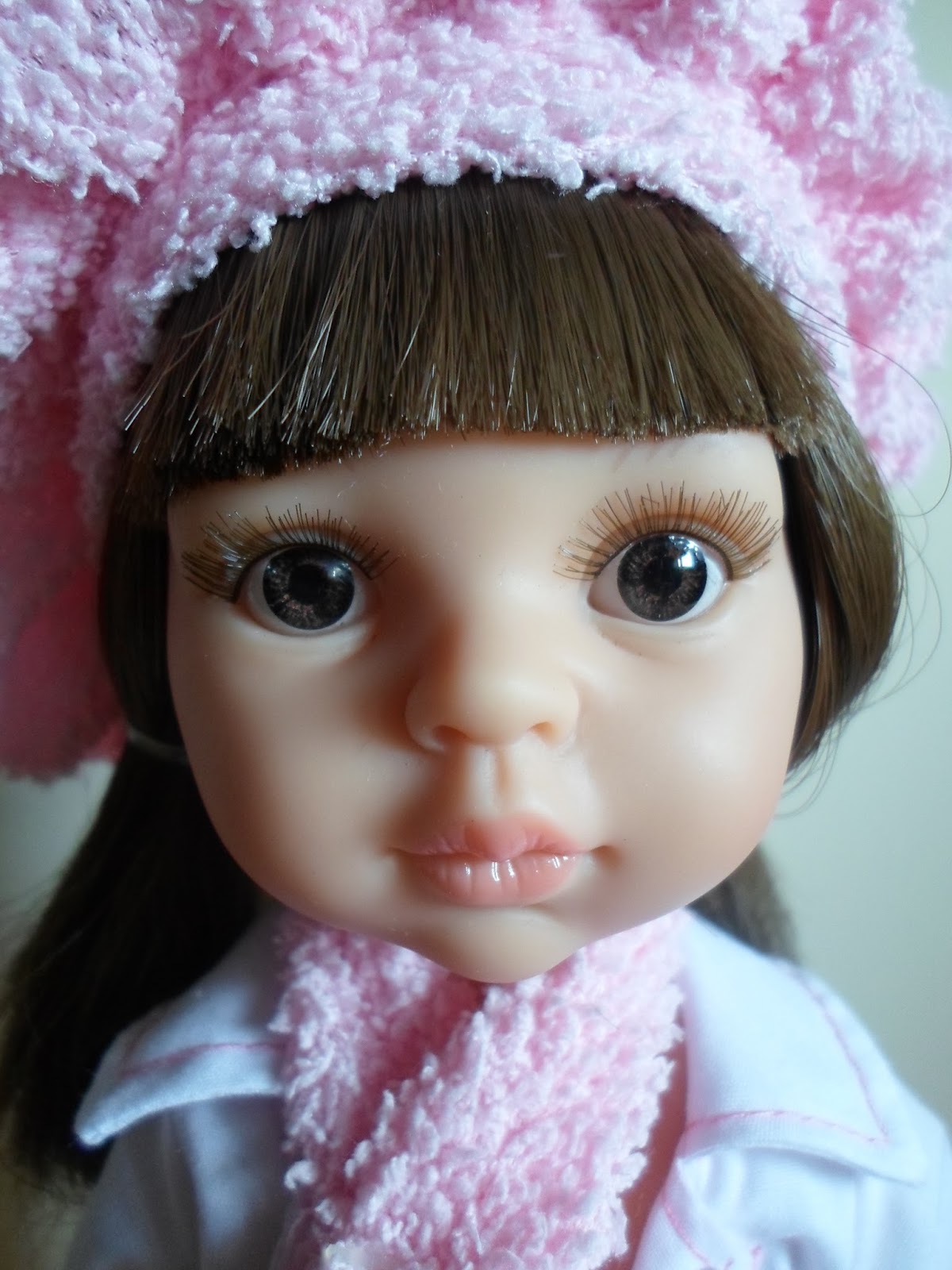 Su cara enamora(siempre mi cámara hace lo mismo, le ensancha y afea la cara a las muñecas, si es que son más bonitas al natural... Bueno, realmente pasa lo mismo con las personas...). Tiene unos labios gruesos con un bonito tono de labios rosado y una nariz tocha muy graciosa. Sus ojos son muy bonitos y expresivos, con muchísimas pestañas, y sobre ellos encontramos sus cejas, dibujadas trazo a trazo.