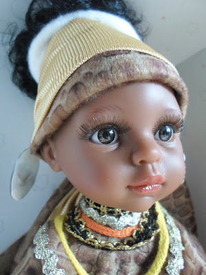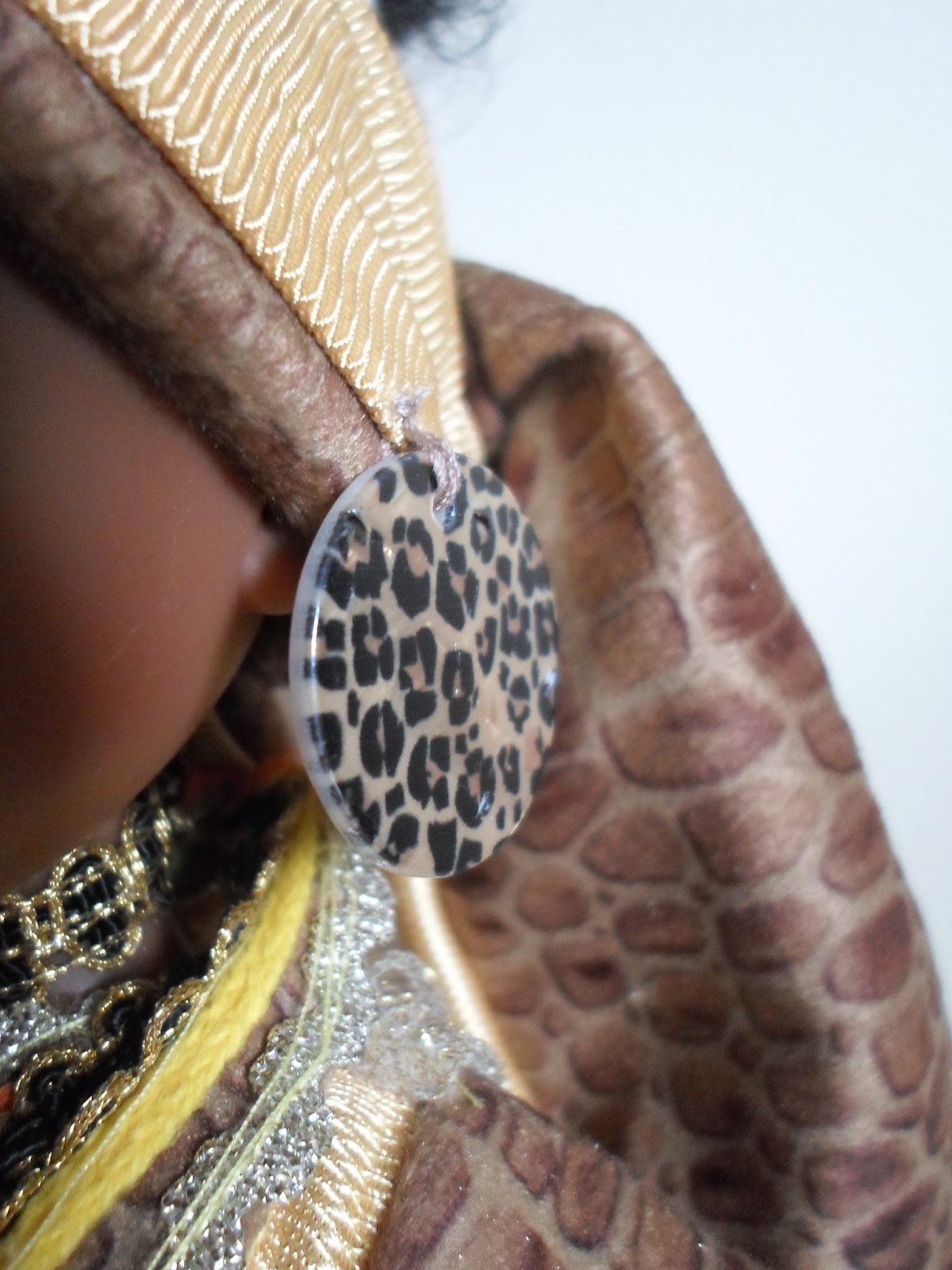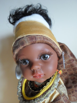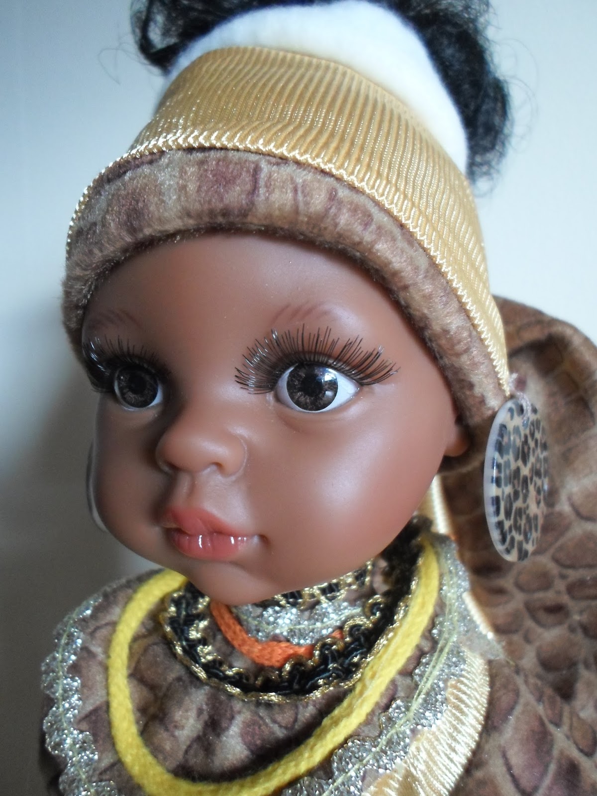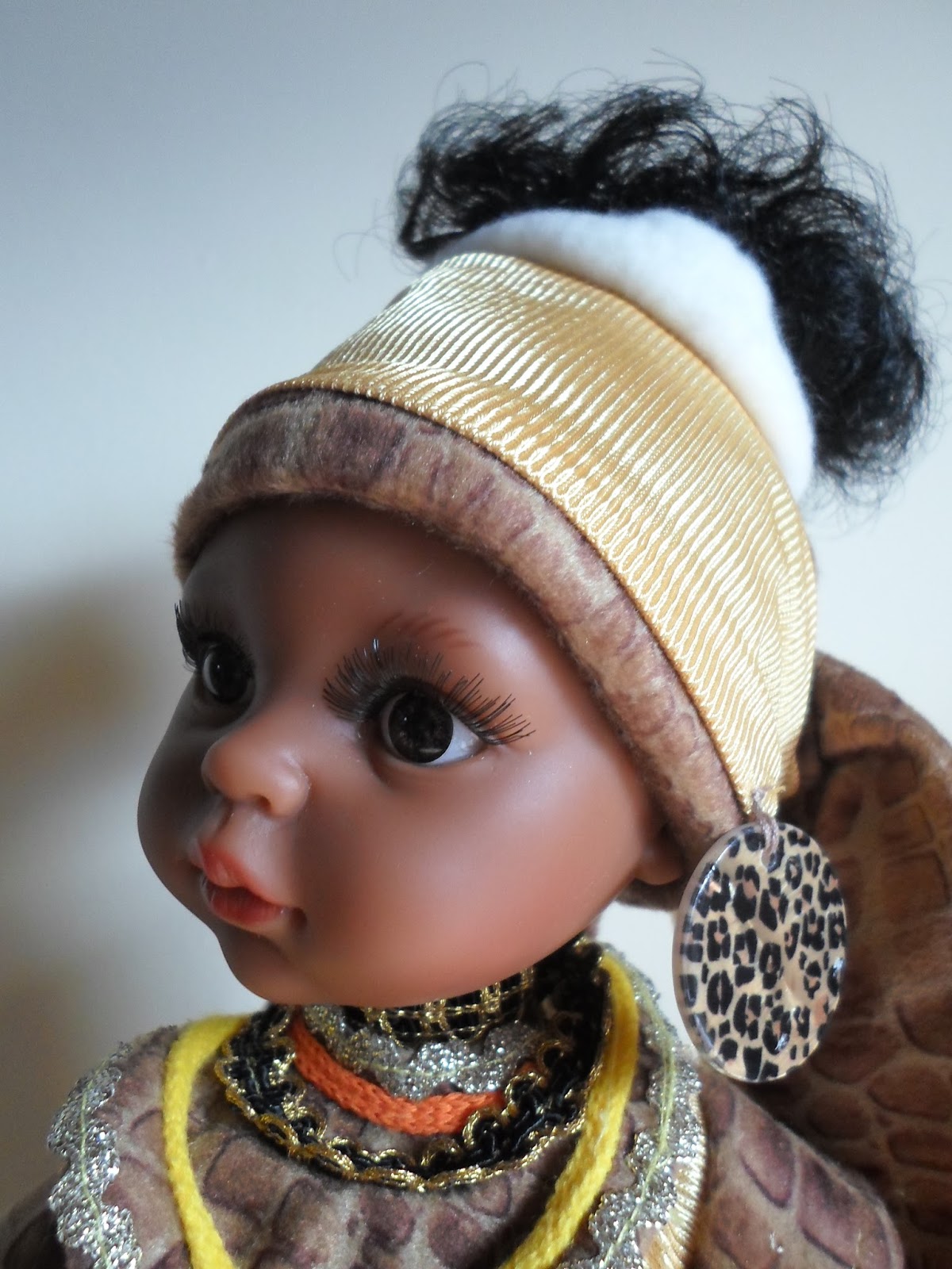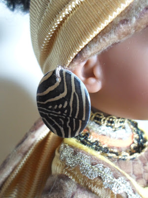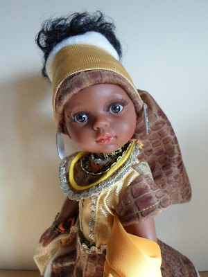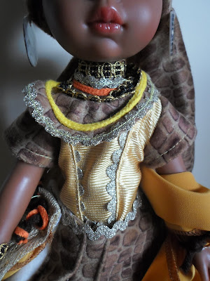 Su precioso y rizado pelo negro está recogido en un moño alto, que está envuelto en la misma tela que la de la falda, y por encima un pañuelo dorado, igual que el de la zona del pecho. Luce dos pendientes de aro con estampado animal (supongo que están cosidos al pañuelo para no hacerle agujeros en las orejas a la muñeca).