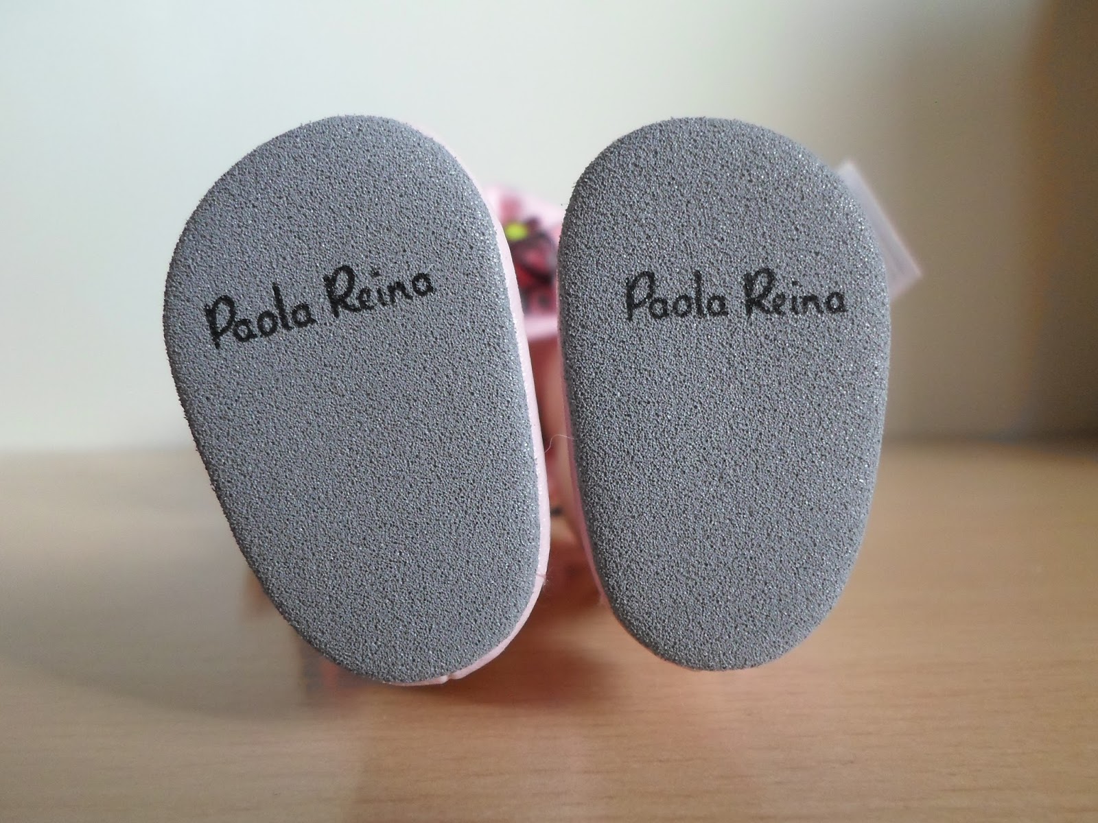 Su calzado son unas sandalias negras cruzadas muy bonitas con el logo de la empresa estampado en las suelas.