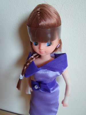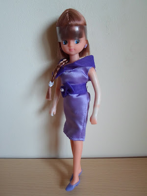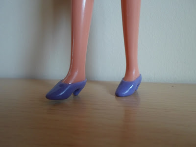 Sus zapatos son morados y de plástico blando, como de goma, pero más resistentes. Su vestido le llega aproximadamente por las rodillas y es del mismo color que los zapatos, excepto el lazo y los "volantes" del cuello, que a parte de ser más oscuros, son de una tela más áspera que el raso, que es la tela que constituye la mayoría del vestido.