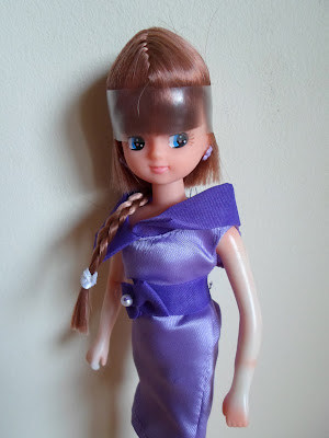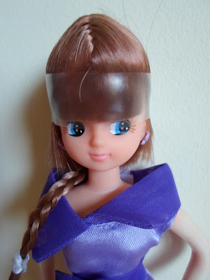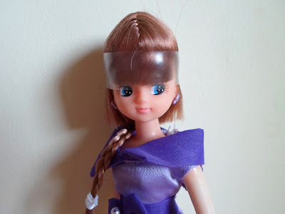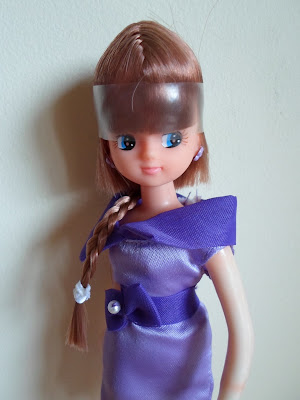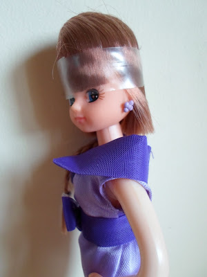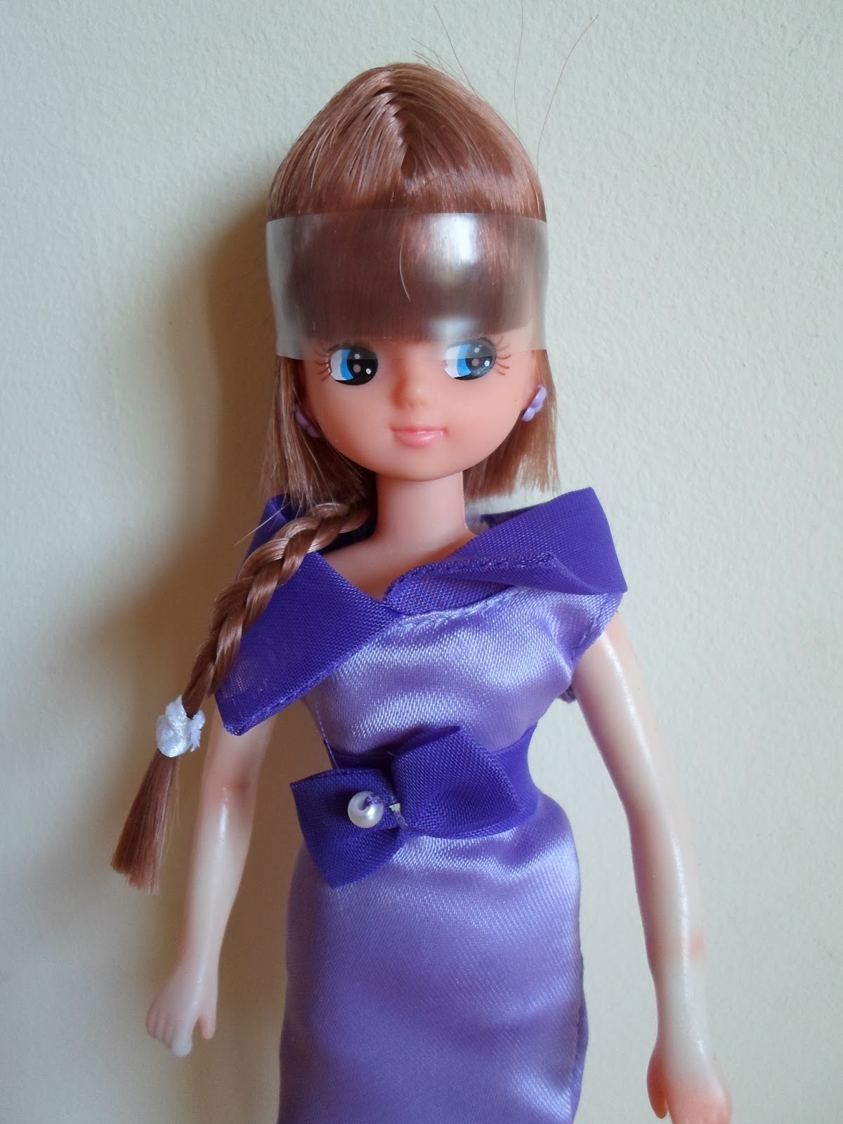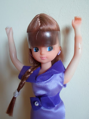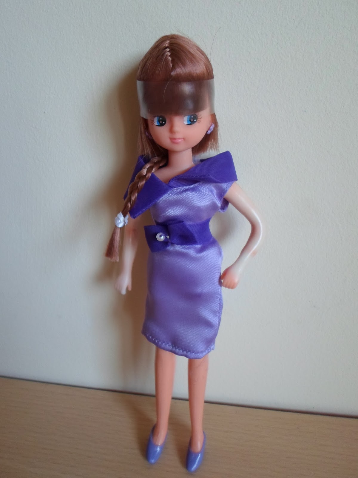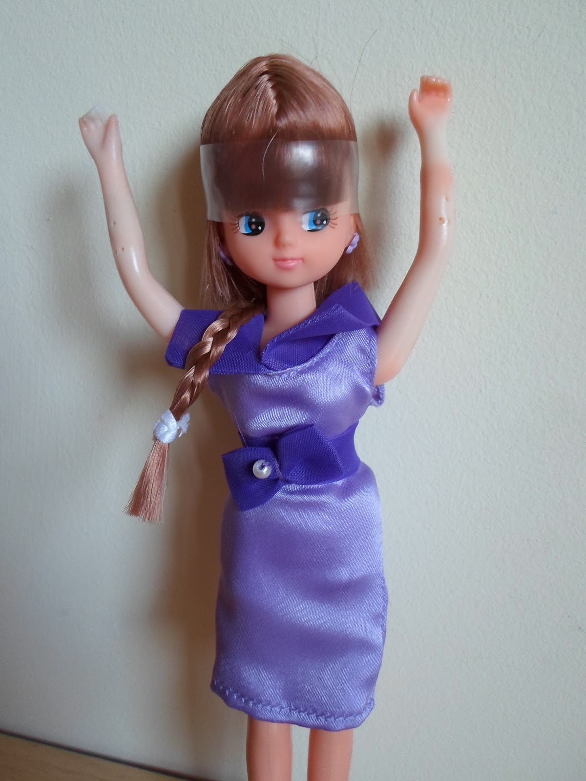 Mi muñeca tiene algunas manchas en los brazos, cosa normal, pero por suerte no son muchas. Además, todos los modelos con flequillo llevan una cinta de plástico para que se les mantenga bien peinado, así que yo no pienso quitárselo. Todo su cuerpo excepto la cabeza son de plástico duro, aunque con textura blanda, como por ejemplo las piernas de Barbie. Sus brazos son flexibles, pero llevaba tanto tiempo sin moverlos que me ha costado un poco.