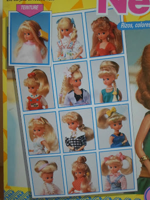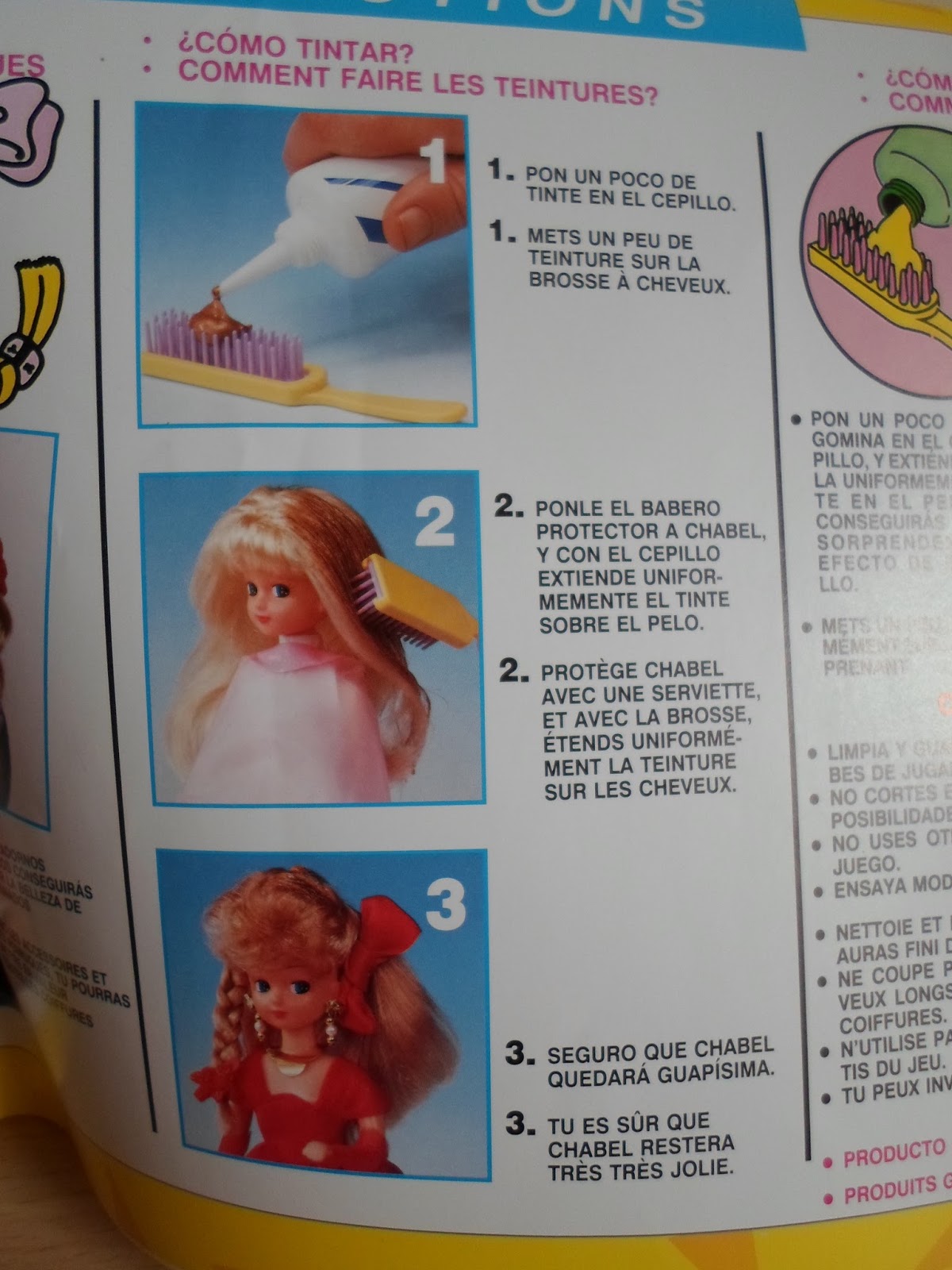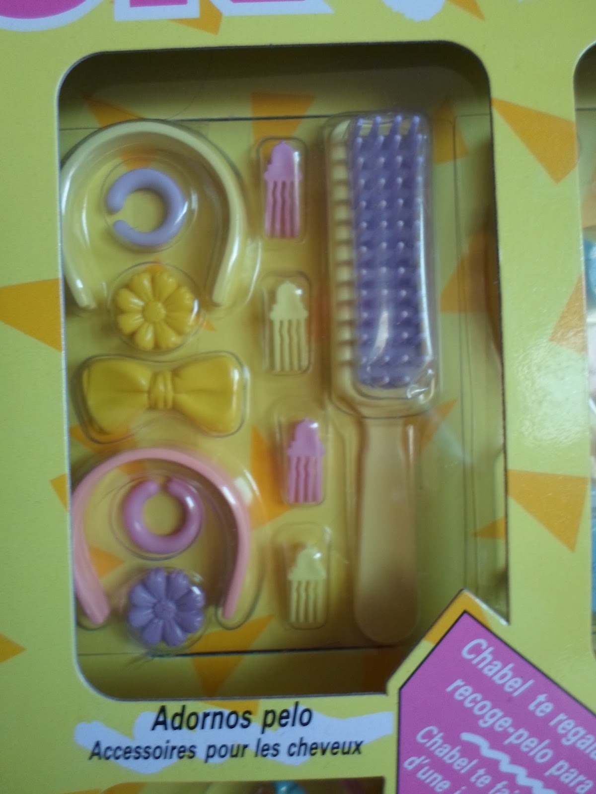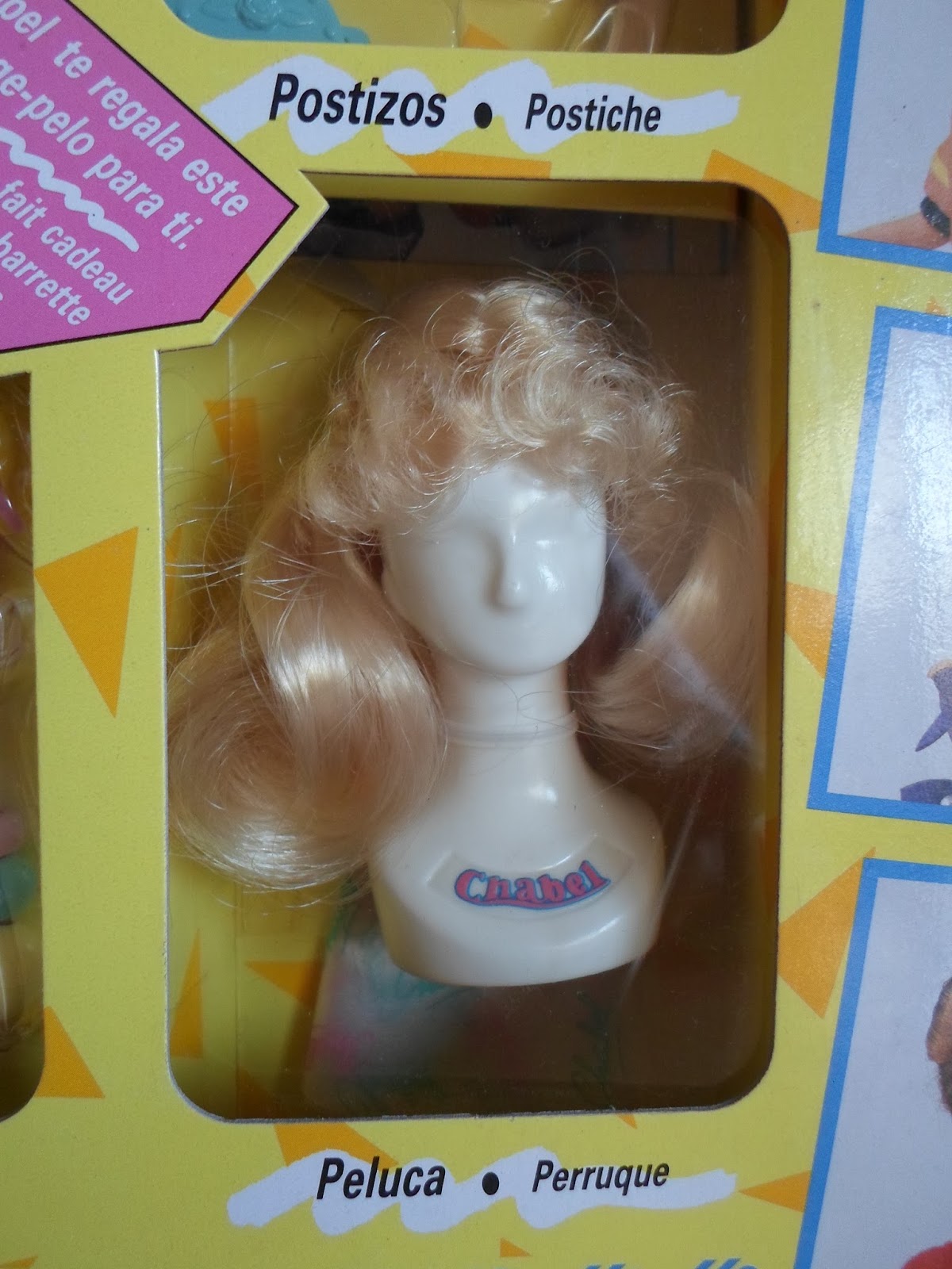 Aquí podéis ver su bonita caja y todos los accesorios que alberga... Adornos para el pelo de las niñas (¡muy ochenteros!), postizos para el pelo de la muñeca, tinte y gomina, una bonita peluca rubia con "babero" para que no se manche (no pierden detalle), y maquillaje como sombras y pintalabios (en el cual pone Denenas Guapas, una línea de Feber de belleza, ellos lo aprovechaban todo), pequeños adornos para el pelo de la muñeca y un rizador.