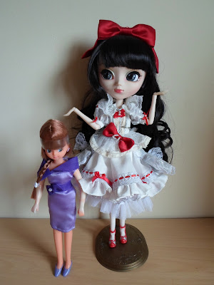 Aquí tenéis las comparaciones de medidas con Barbie, Nancy y Pullip. Como veis es bastante chiquitita en comparación, pero tiene un tamaño ideal para jugar. Mira que es raro, pero en estas fotos se la ve más como es en realidad, ¿será que cuanto más cerca hago las fotos la cámara distorsiona más las muñecas?